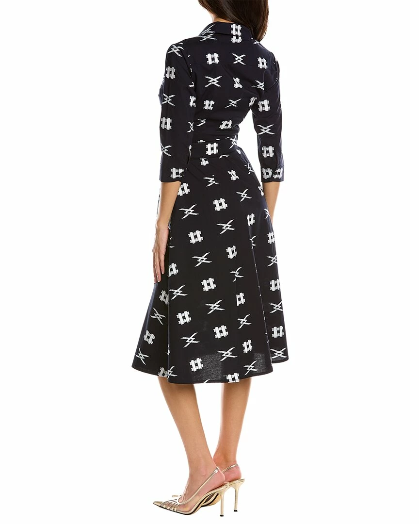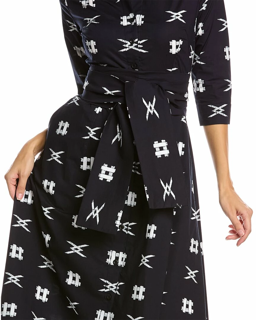 - Abel Shirtdress in indigo ikat with 3/4-length sleeves, side slip pockets, belted waist, and removable tie-sash
