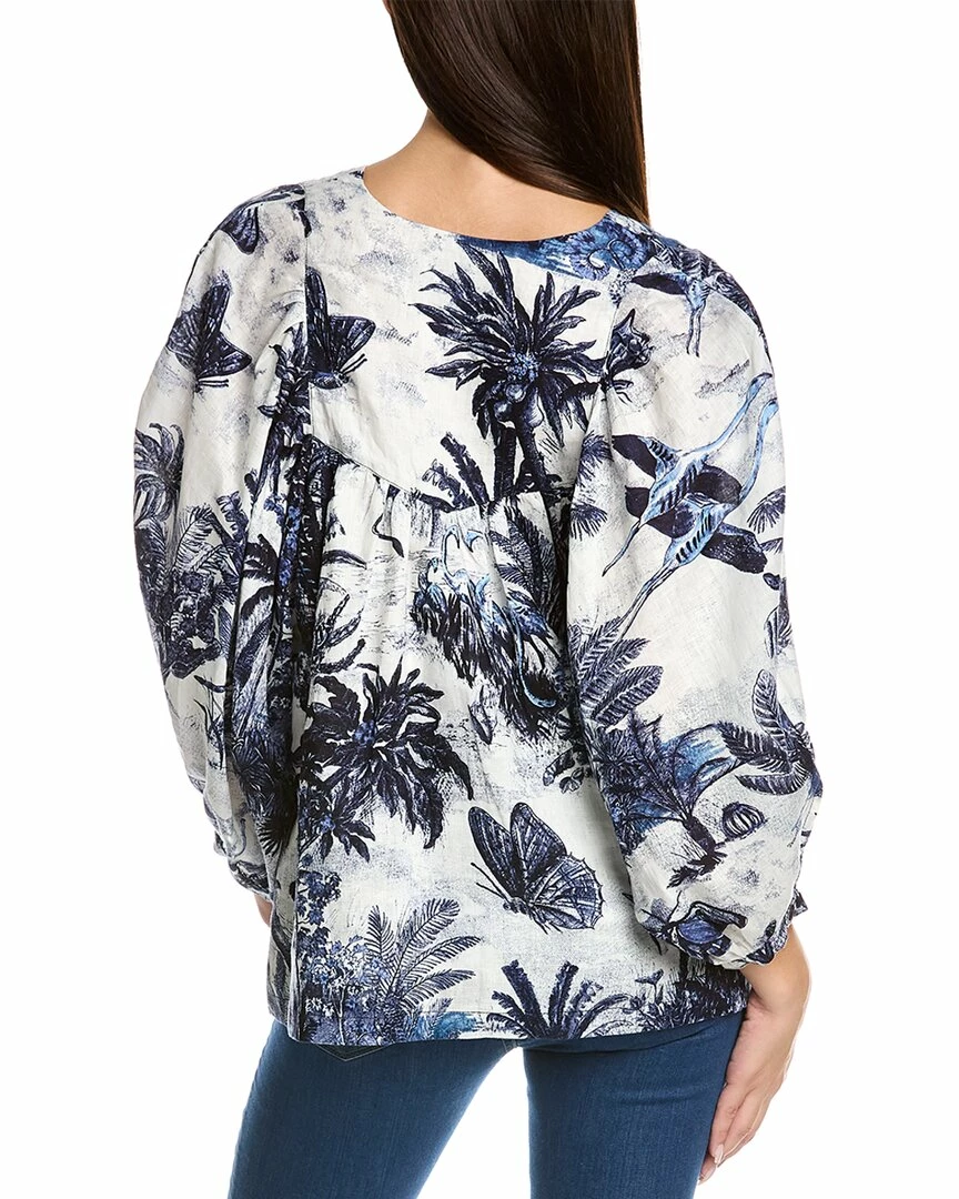 - Anastasia Linen Top in white indigo lewa wildlife with blouson dolman sleeves and button cuffs