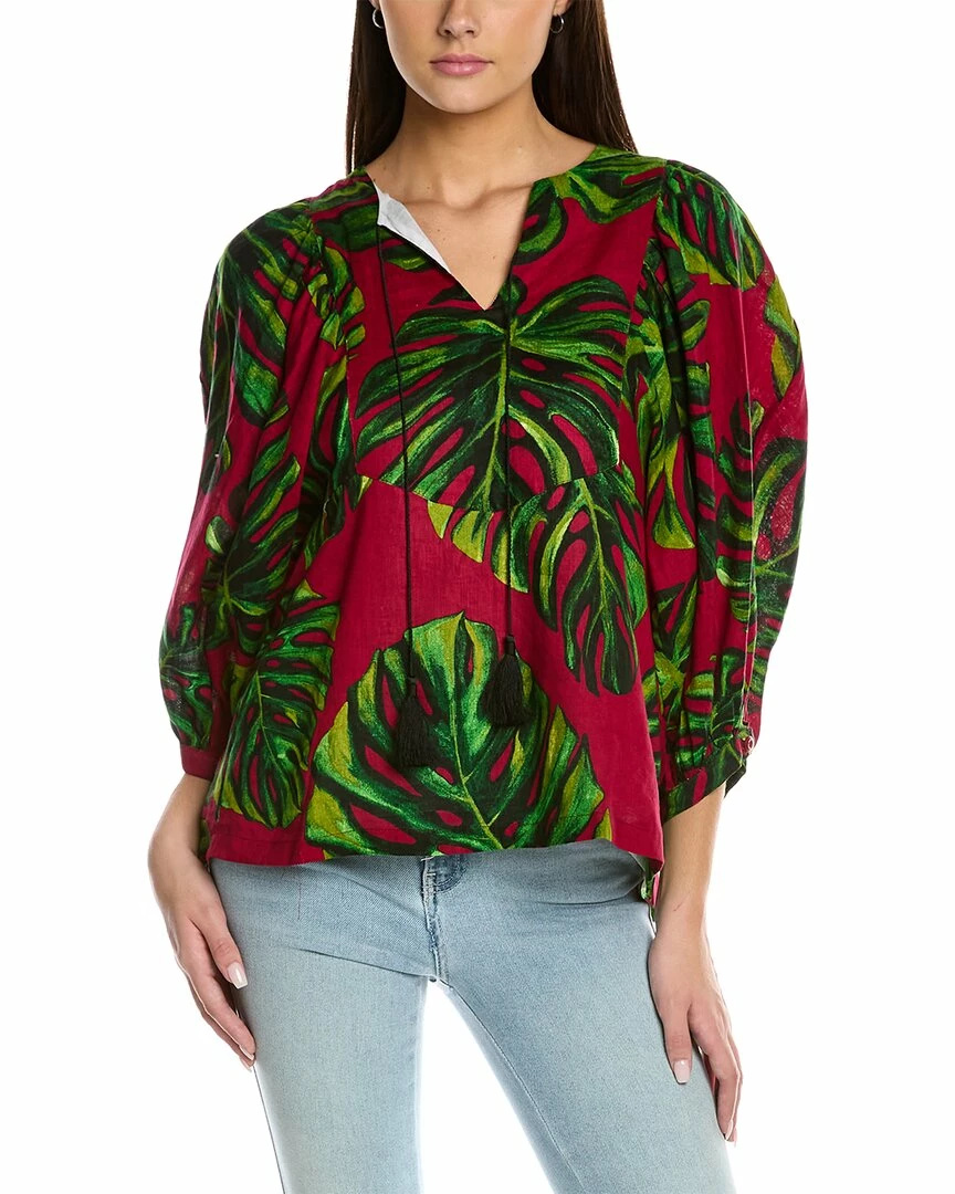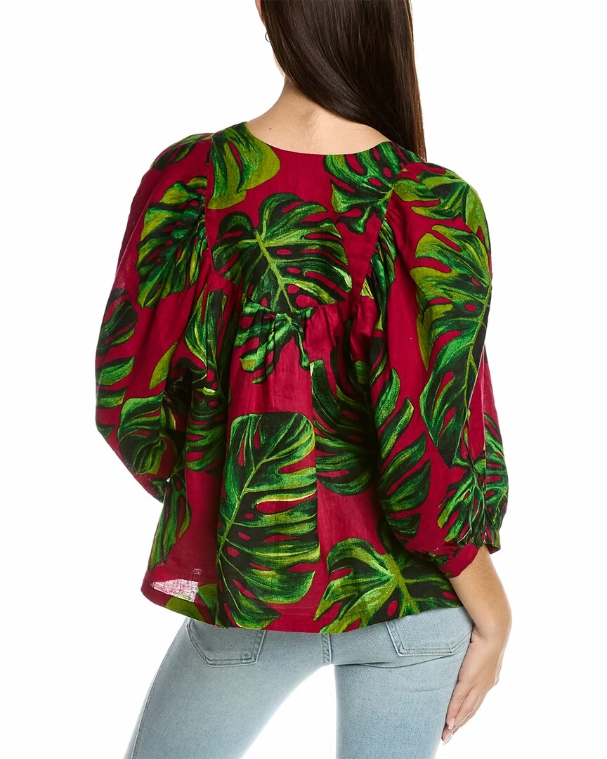 - Anastasia Linen Top in pink monster leaves with blouson dolman sleeves and button cuffs