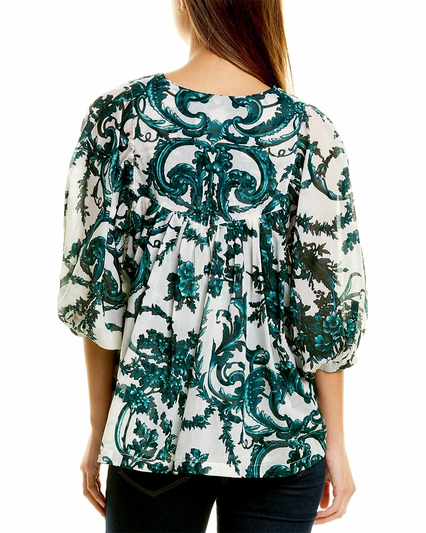 - Anastasia Top in linen filigree white jade with split neck, apron front, and 3/4-length dolman bubble sleeve