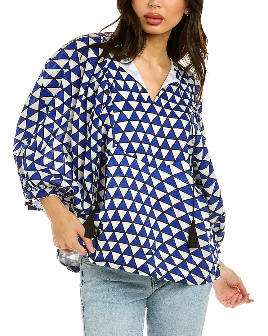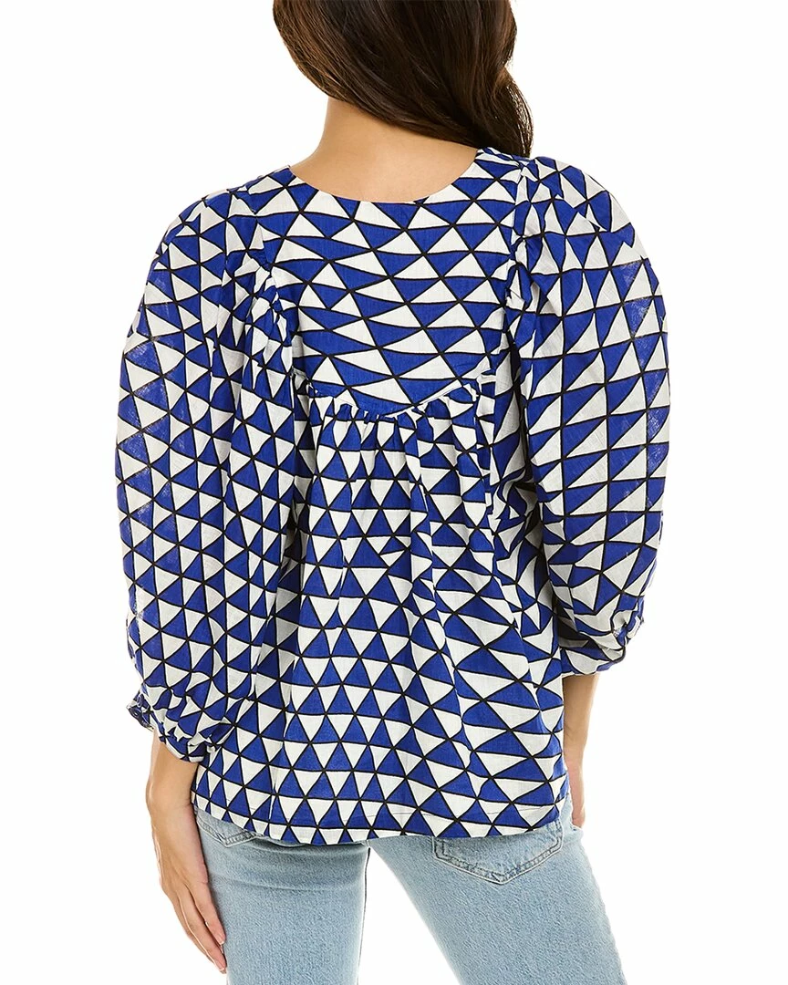 - Anastasia Top in cobalt blue optic triangle with split neck, apron front, and 3/4-length dolman bubble sleeve