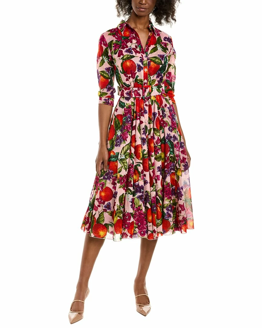 - Aster Midi Dress in soft coral tuscani arancia with side seam pockets, belted waist, and tie sash