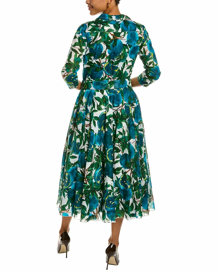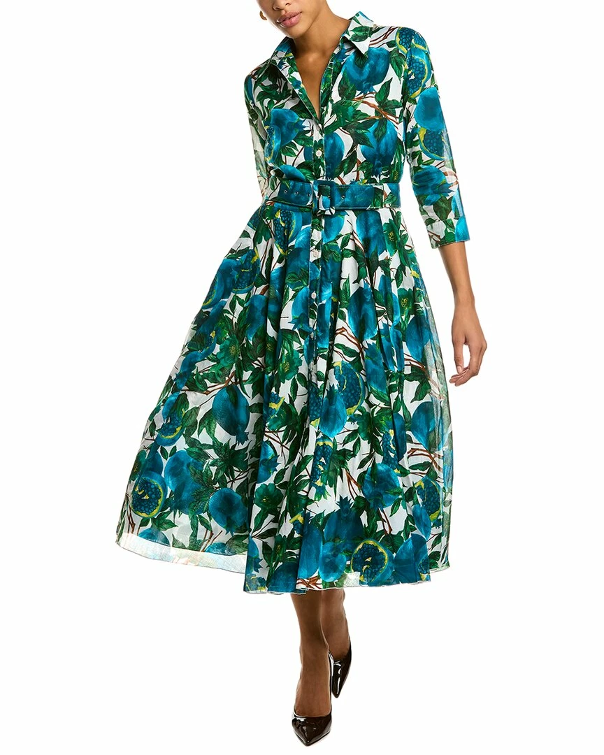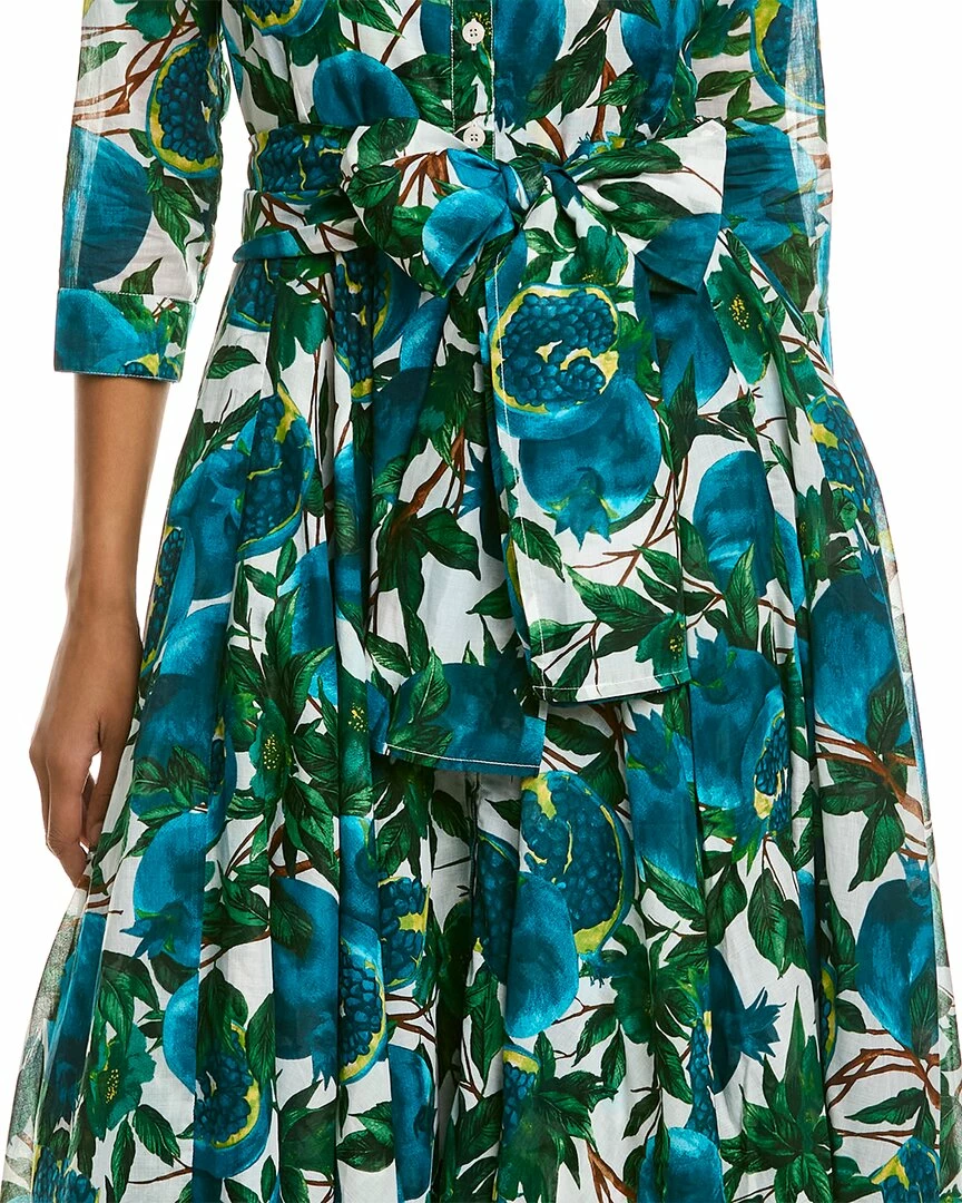 - Aster Midi Dress in aqua pomegranate with side seam pockets, belted waist, and tie sash