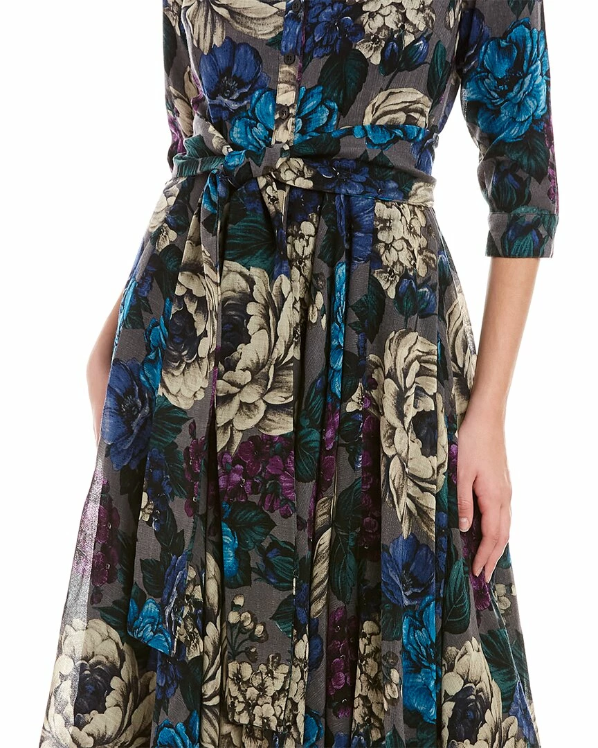 - Aster Midi Dress in grey blue abelia with shirred circle skirt and belted waist