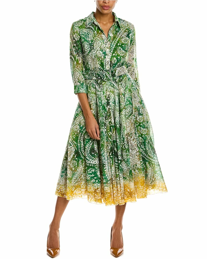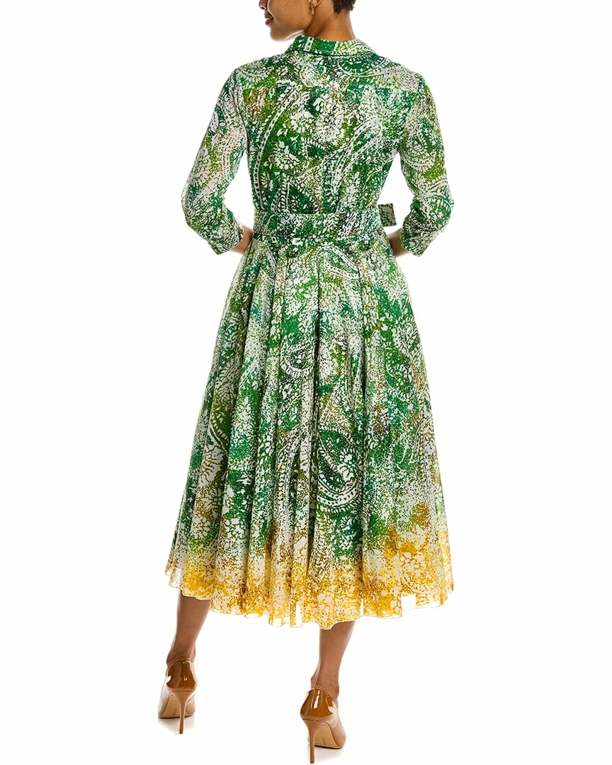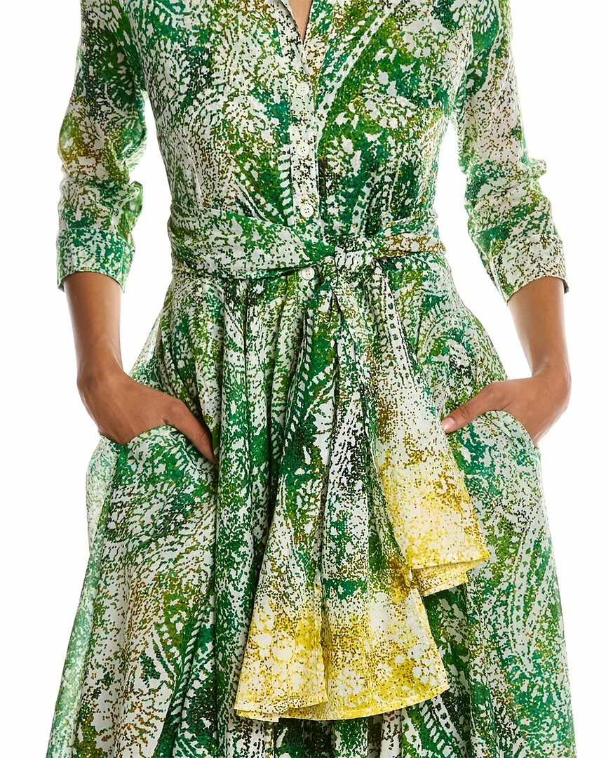 - Aster Midi Dress in green indie paisley with side seam pockets, belted waist, and tie sash