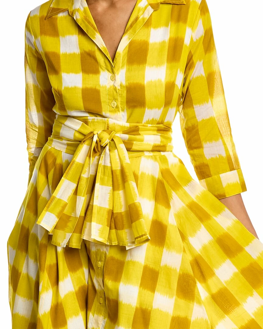 - Aster Midi Dress in white yellow ghana check with side seam pockets, belted waist, and tie sash