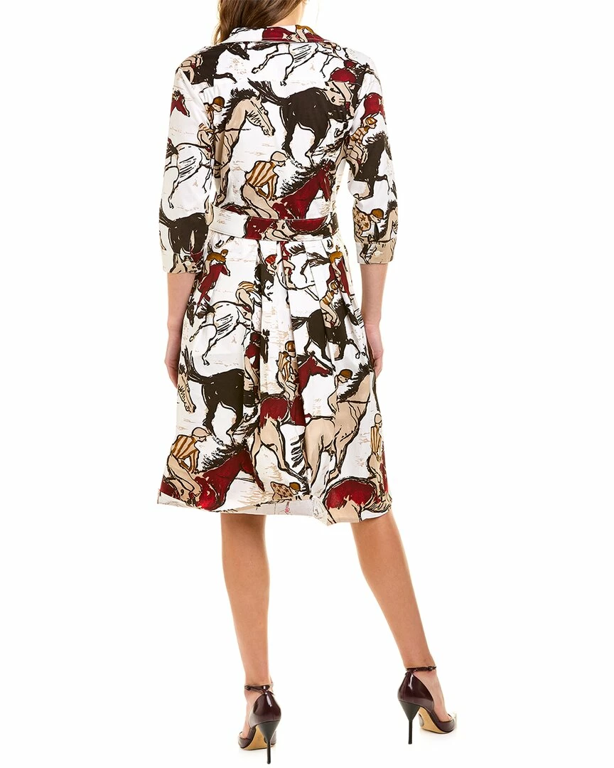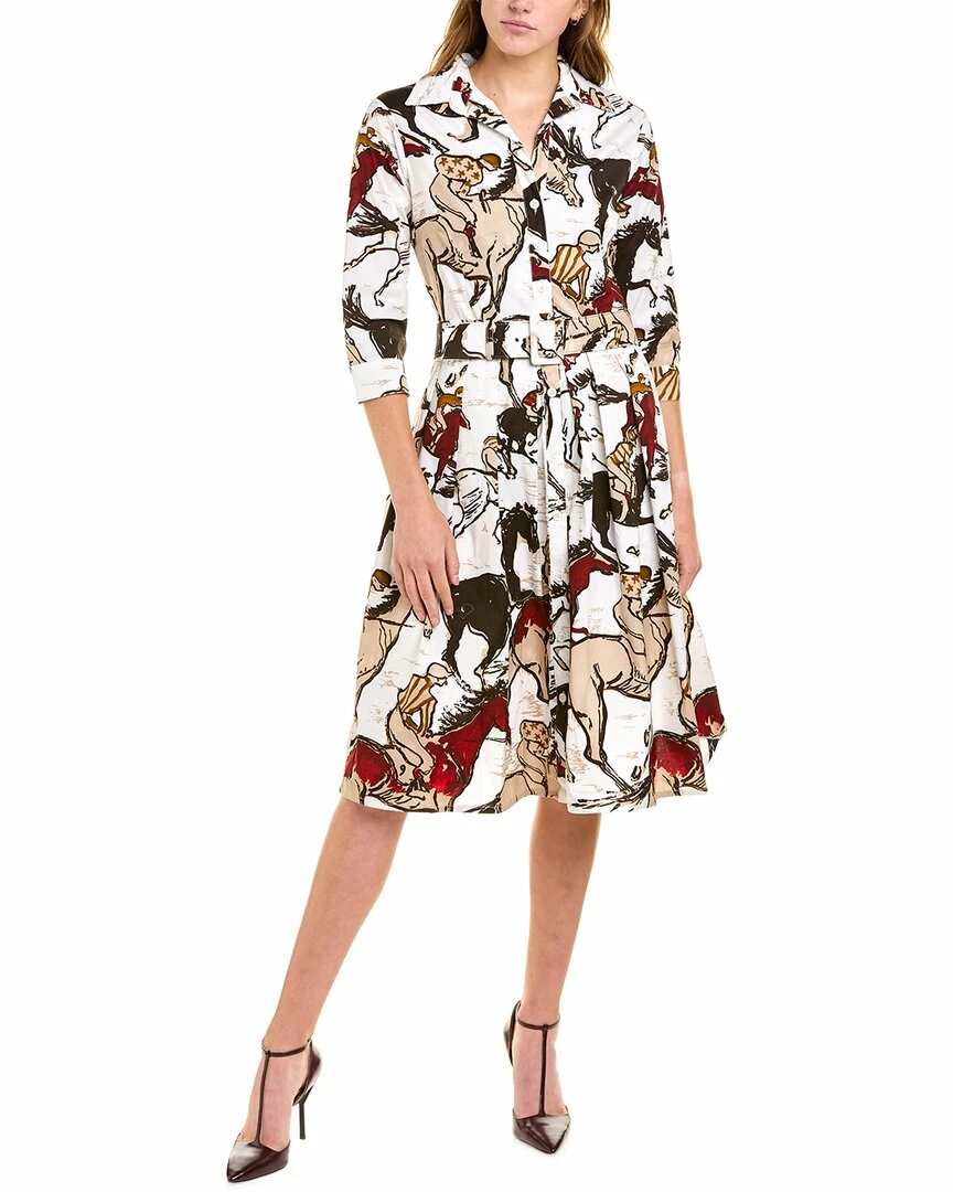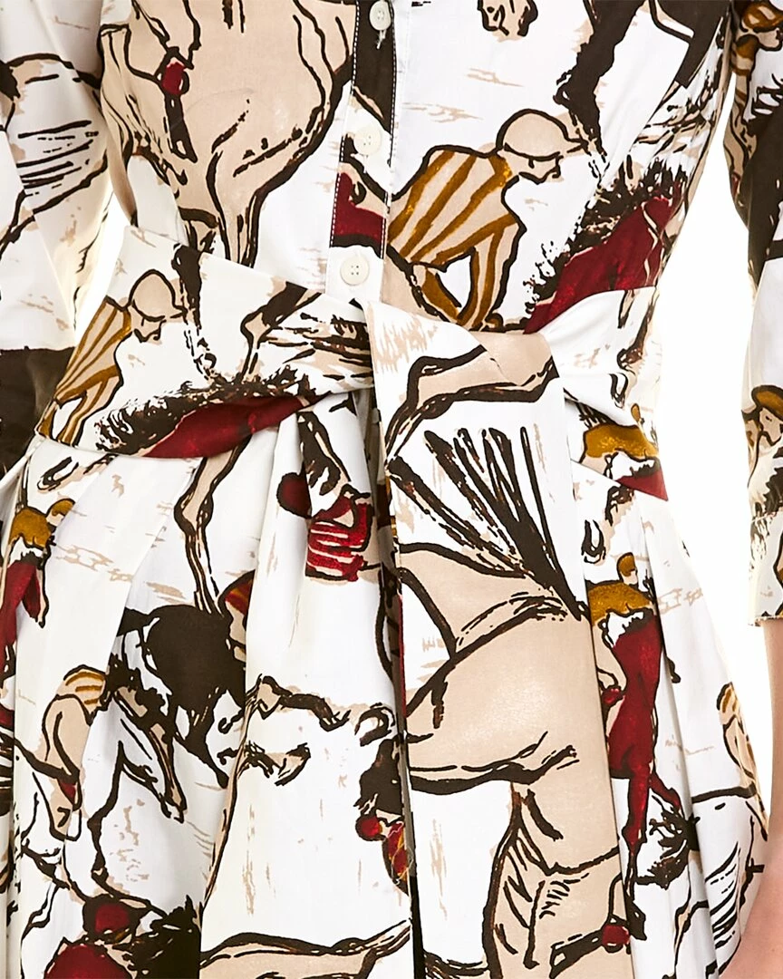 - Audrey 1 Shirtdress in white and red horse racing with 3/4-length sleeves, pleated skirt, side seam pockets, removable belt, and tie sash