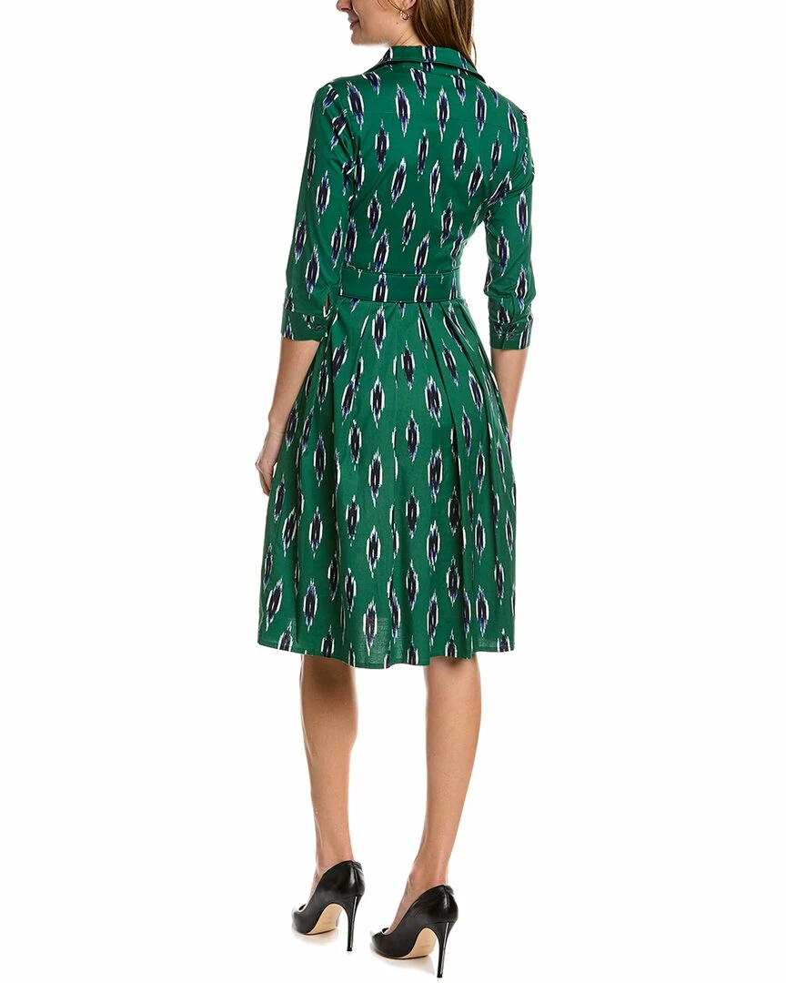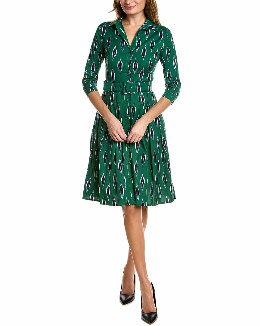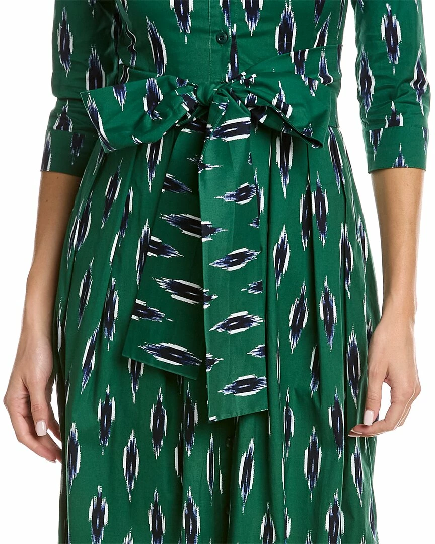 - Audrey 1 Shirtdress in ivy green west Indie ikat with 3/4-length sleeves, pleated skirt, side seam pockets, belted waist, and tie-sash