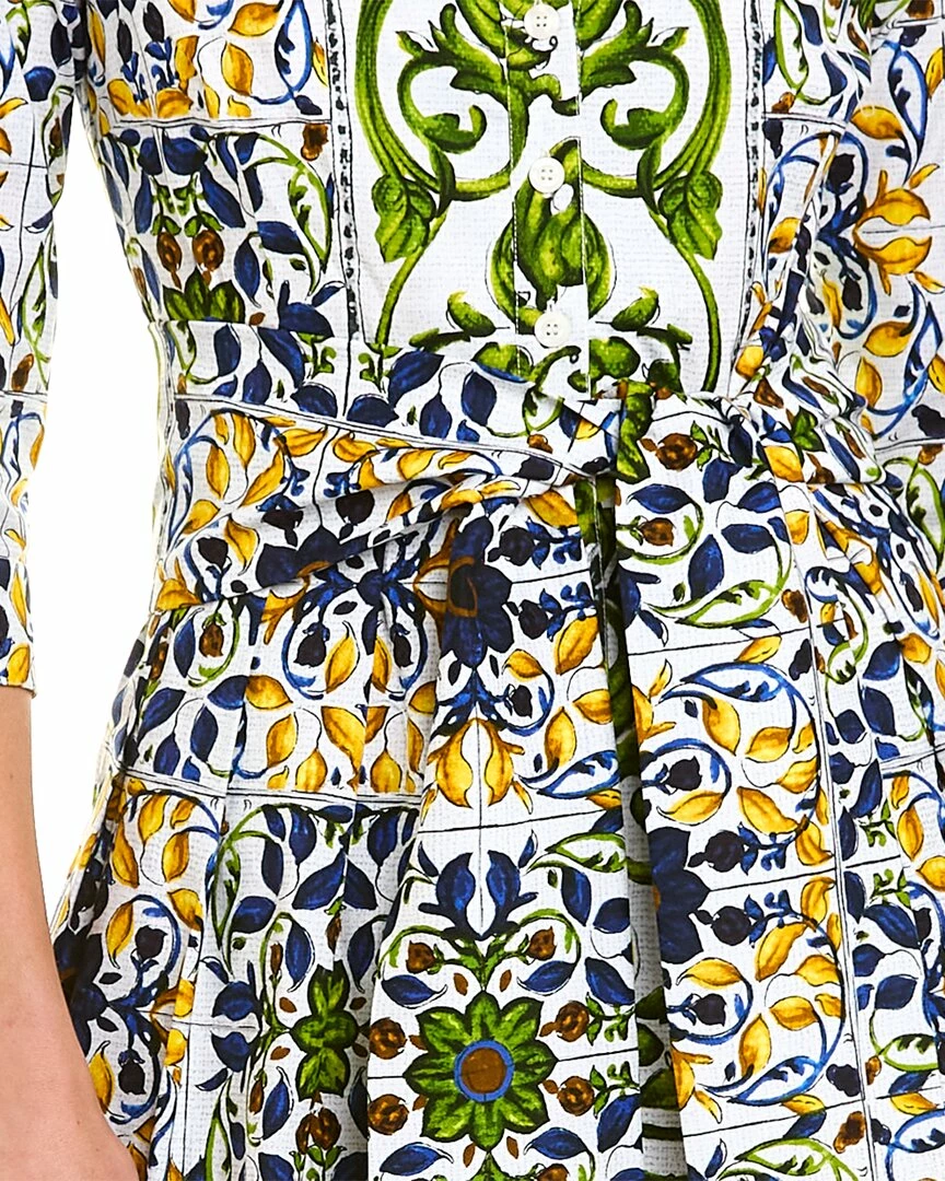 - Audrey 1 Shirtdress in indigo tuile d itale with 3/4-length sleeves, pleated skirt, side seam pockets, removable belt, and tie sash