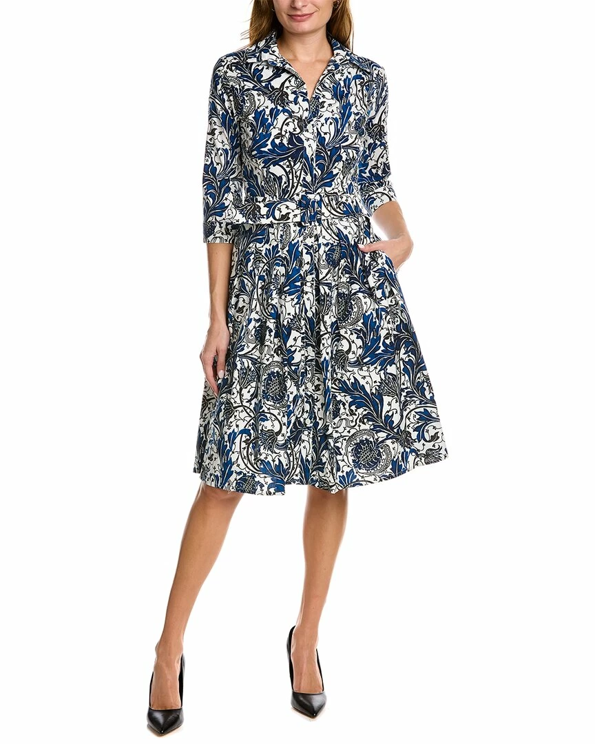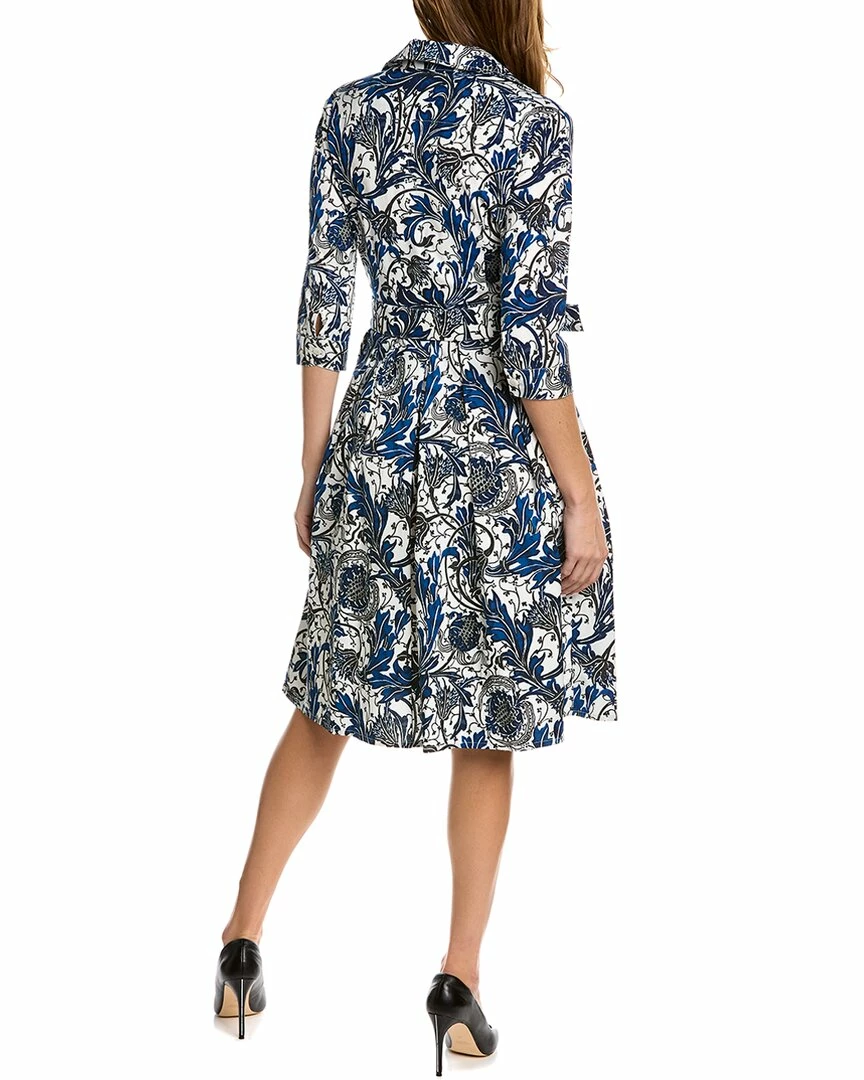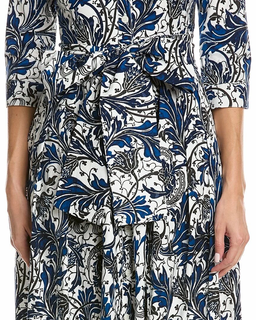 - Audrey 1 Shirtdress in ivory indigo Zsa Zsa wallpaper with 3/4-length sleeves, pleated skirt, side seam pockets, belted waist, and tie-sash