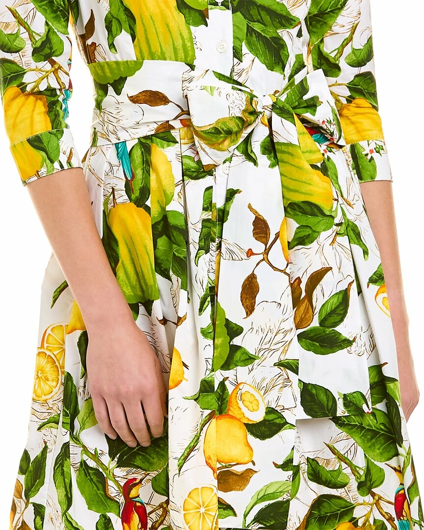 - Audrey 1 Shirtdress in yellow lemon Tuscany with 3/4-length sleeves, pleated skirt, side seam pockets, removable belt, and tie sash