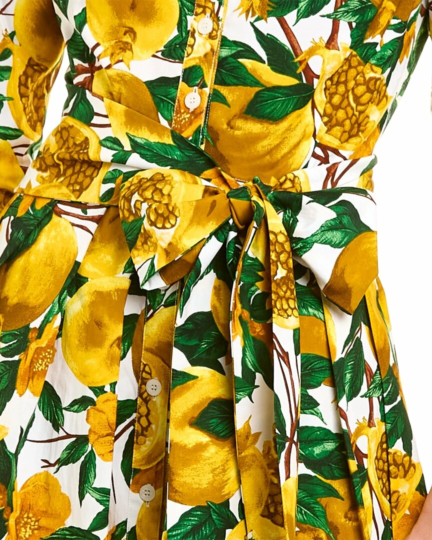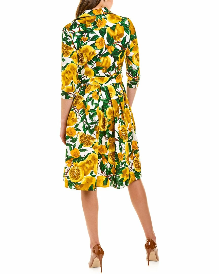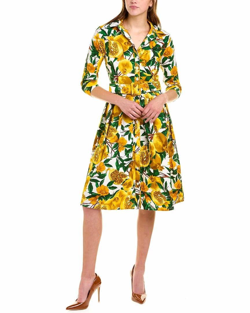 - Audrey 1 Shirtdress in white and yellow pomegranate with 3/4-length sleeves, pleated skirt, side seam pockets, removable belt, and tie sash