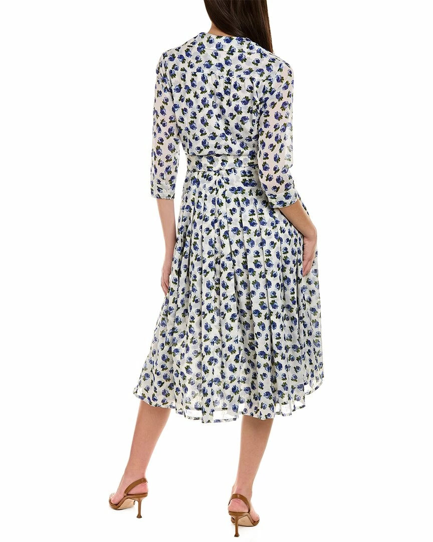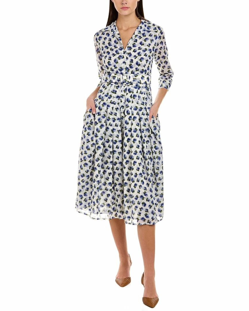 - Audrey 2 3/4-Sleeve Shirtdress in ivory blue common rose with 3/4-length sleeves with button cuffs, pleated skirt, two front pockets, accent belt, and tie-sash
