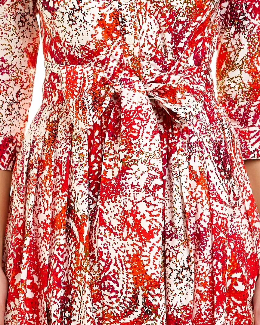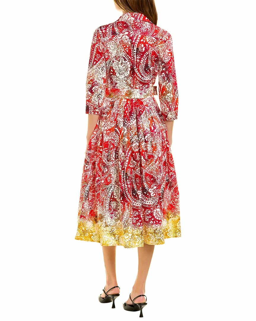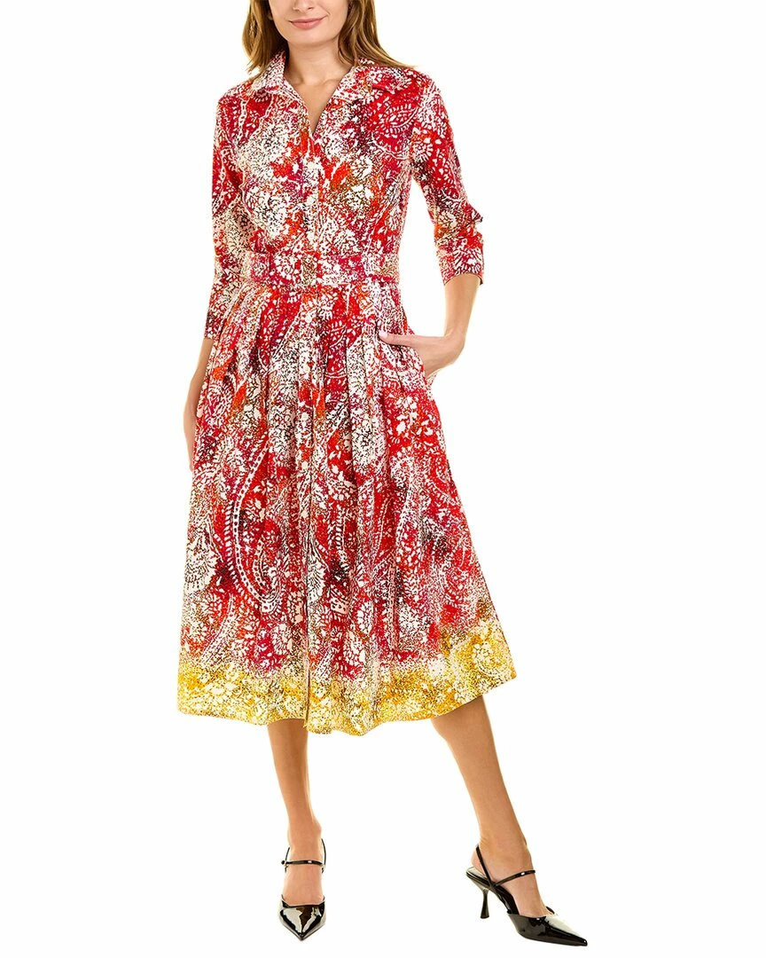- Audrey 2 Shirtdress in red indie paisley with 3/4-length sleeves, pleated skirt, side seam pockets, belted waist, and tie sash