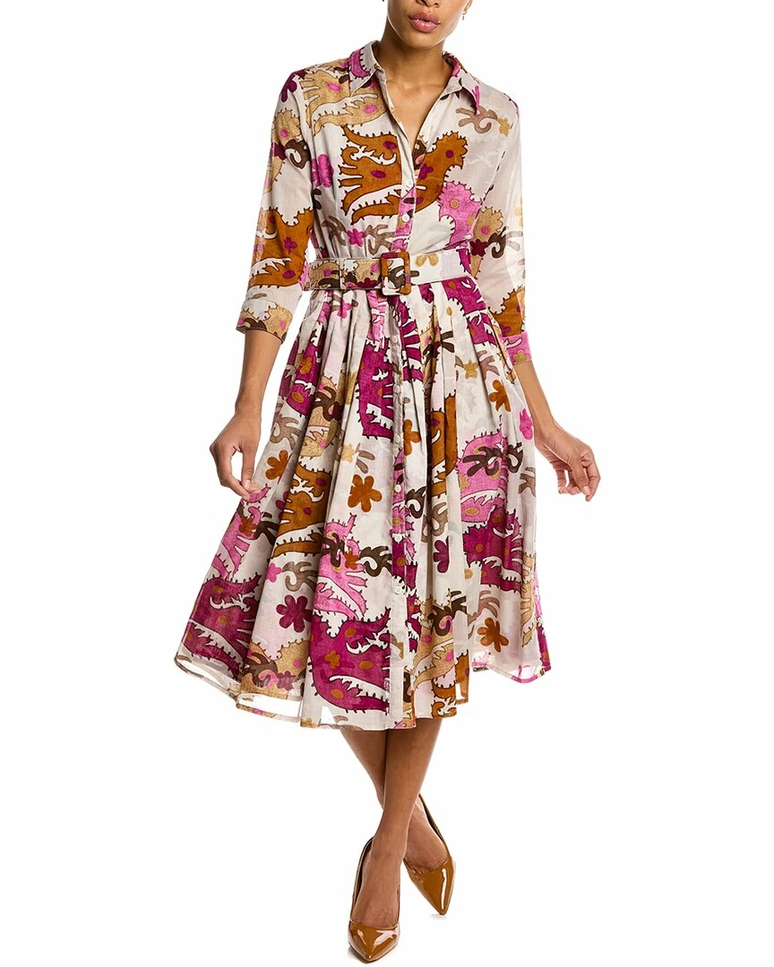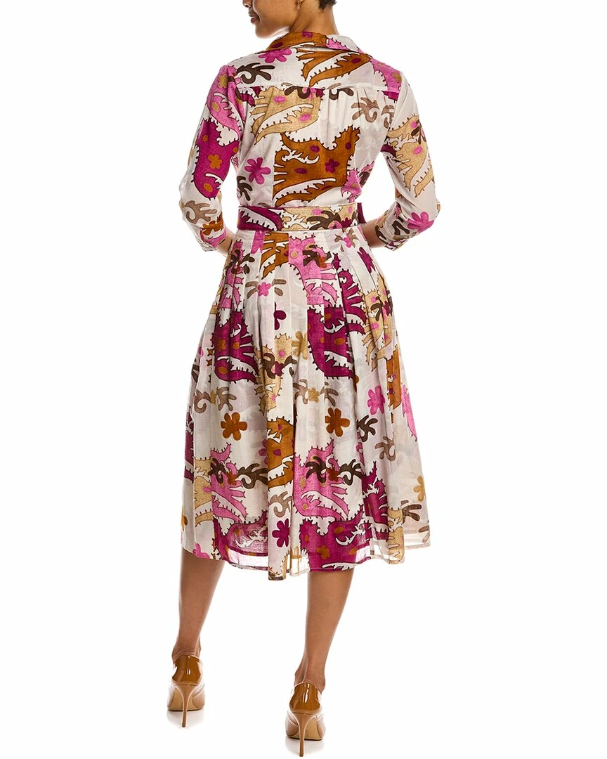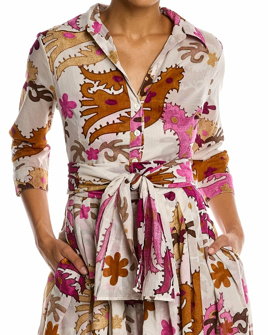 - Audrey 2 Shirtdress in beige pink ukrainian bird with 3/4-length sleeves, pleated skirt, side seam pockets, belted waist, and tie sash