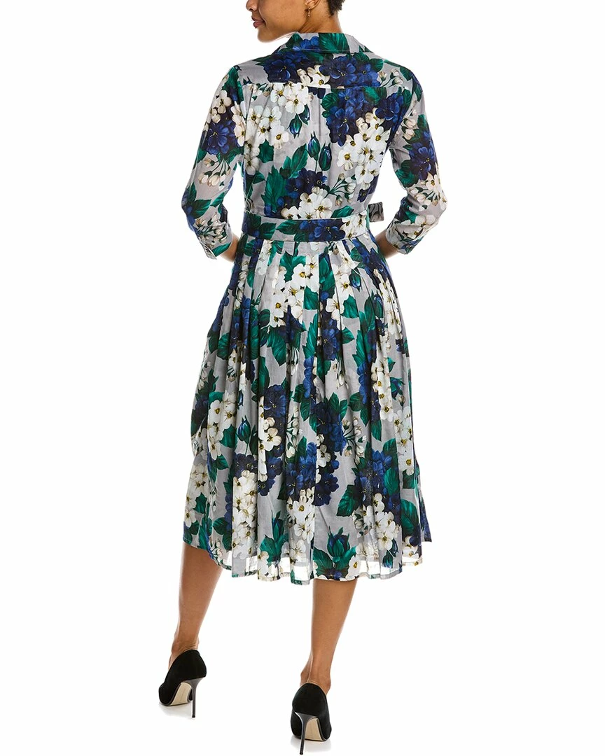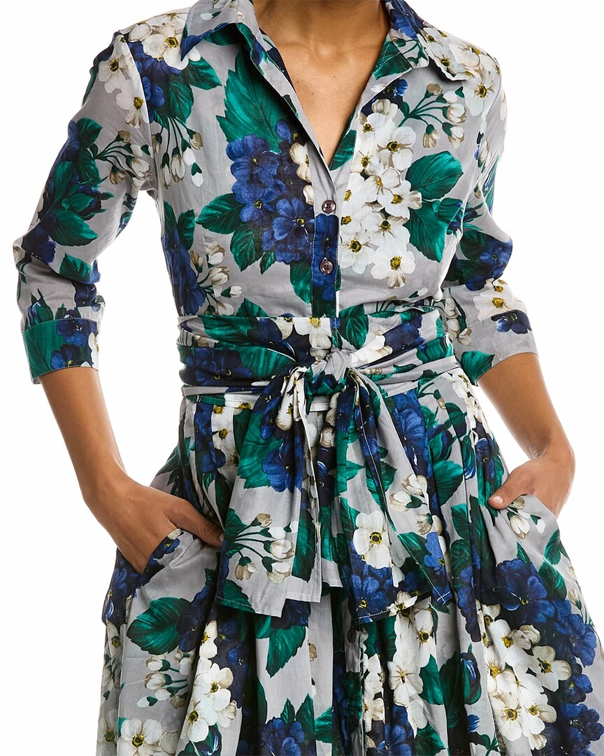 - Audrey 2 Shirtdress in soft grey indigo geranium comb with 3/4-length sleeves, pleated skirt, side seam pockets, belted waist, and tie sash