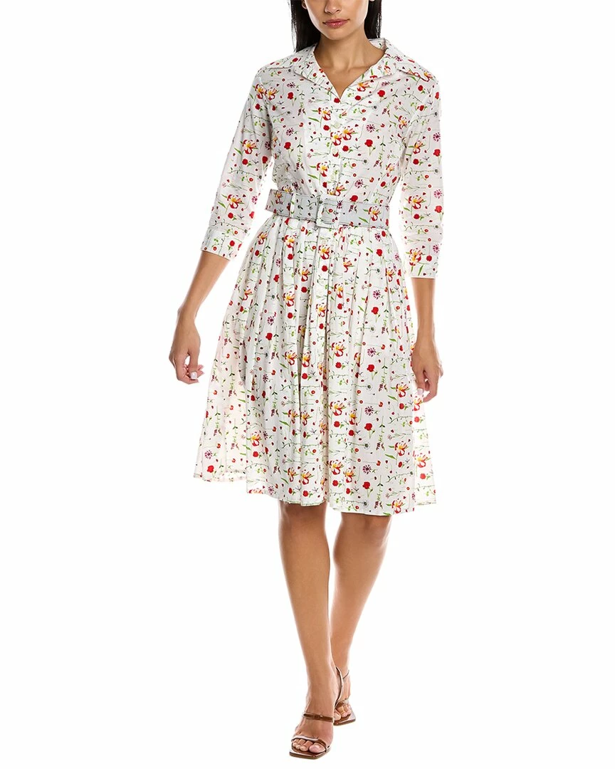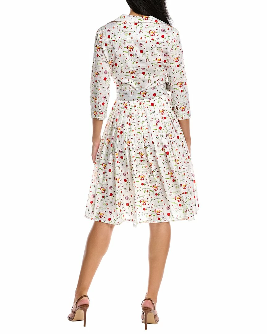 - Audrey #2 Shirtdress in white red marta with spread collar, button cuffs, removable belt and self-tie sash, pleated skirt and dual side seam pockets