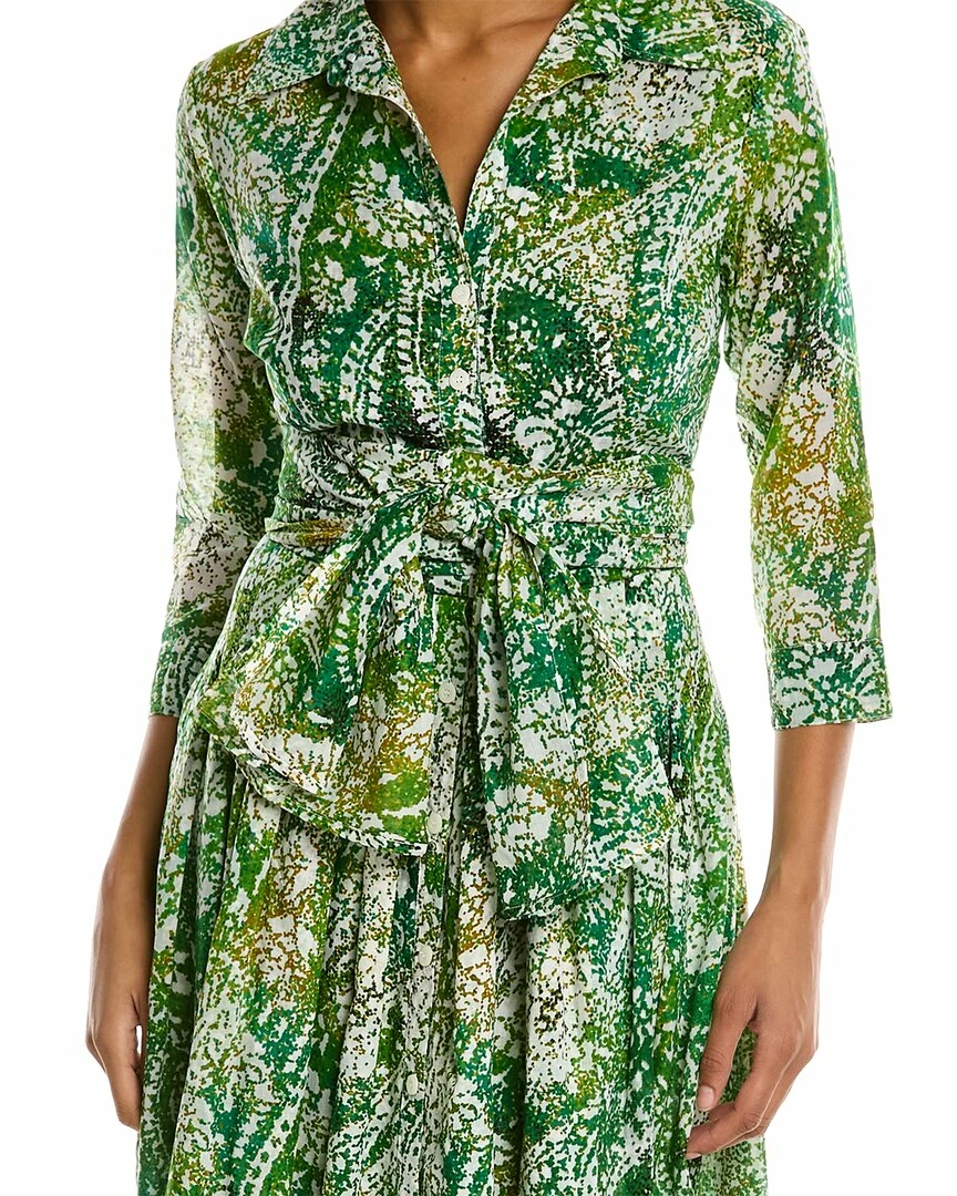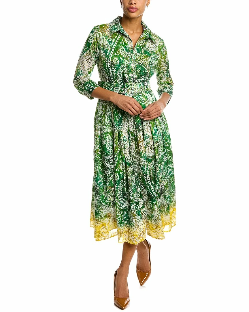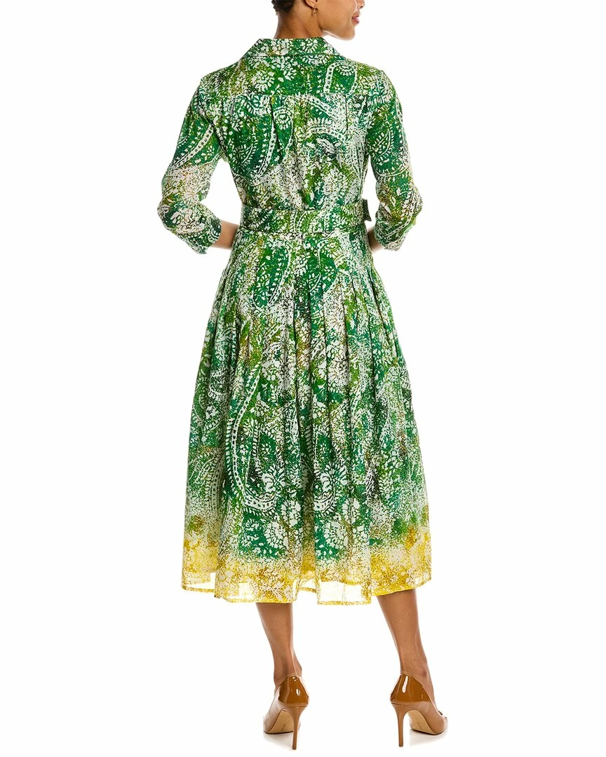 - Audrey 2 Shirtdress in green indie paisley with 3/4-length sleeves, pleated skirt, side seam pockets, belted waist, and tie sash