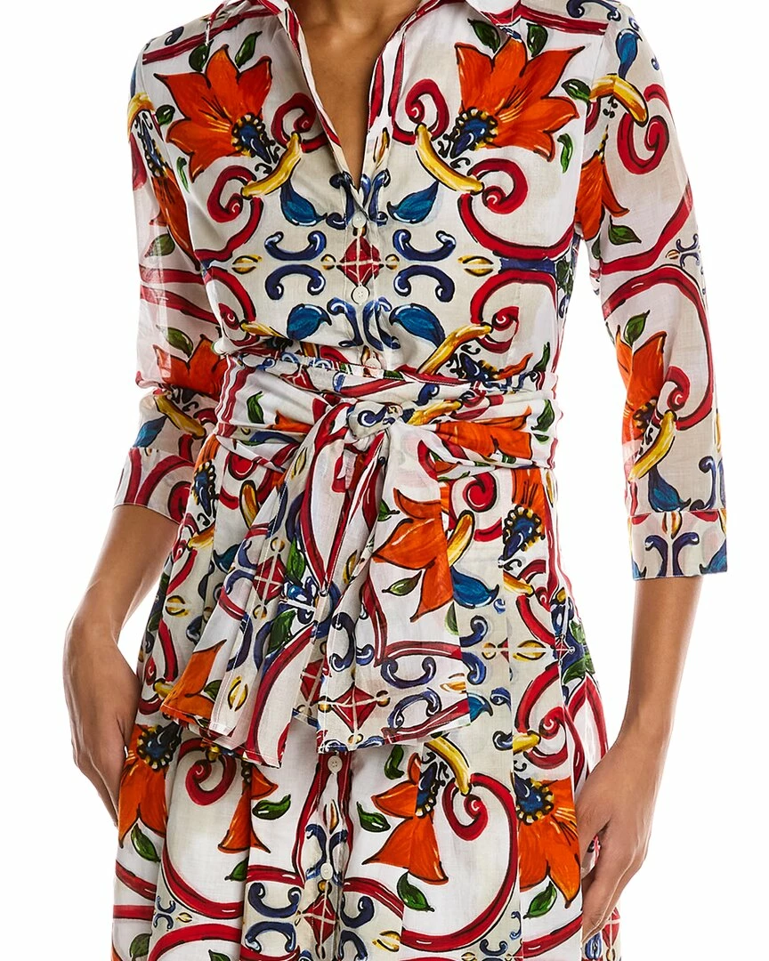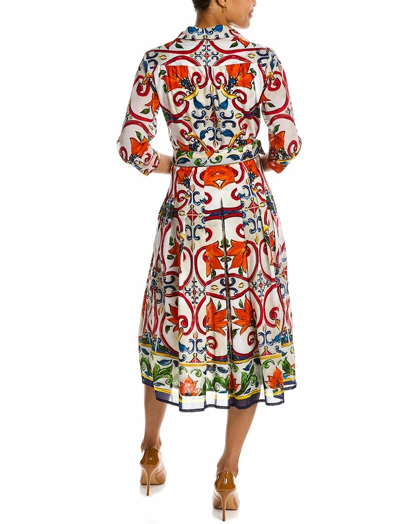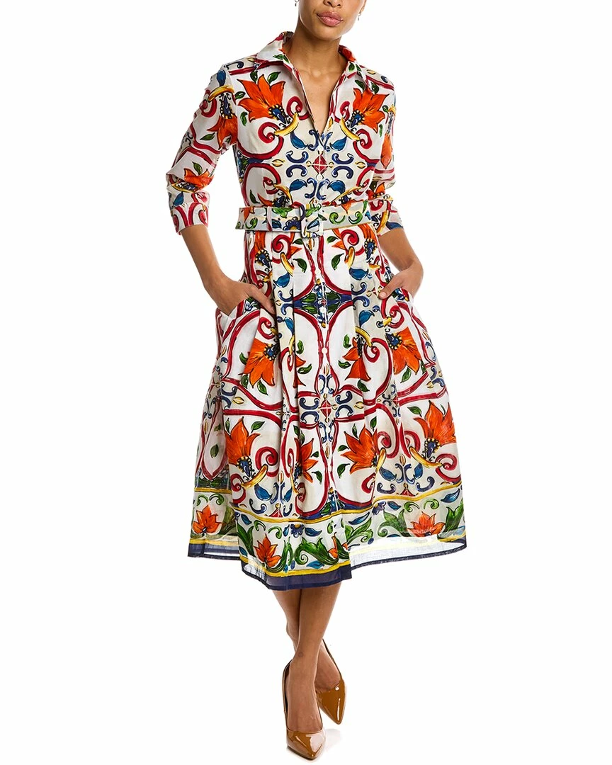 - Audrey 3 Shirtdress in white multi majorca multicolor with 3/4-length sleeves, pleated skirt, side seam pockets, belted waist, and tie sash