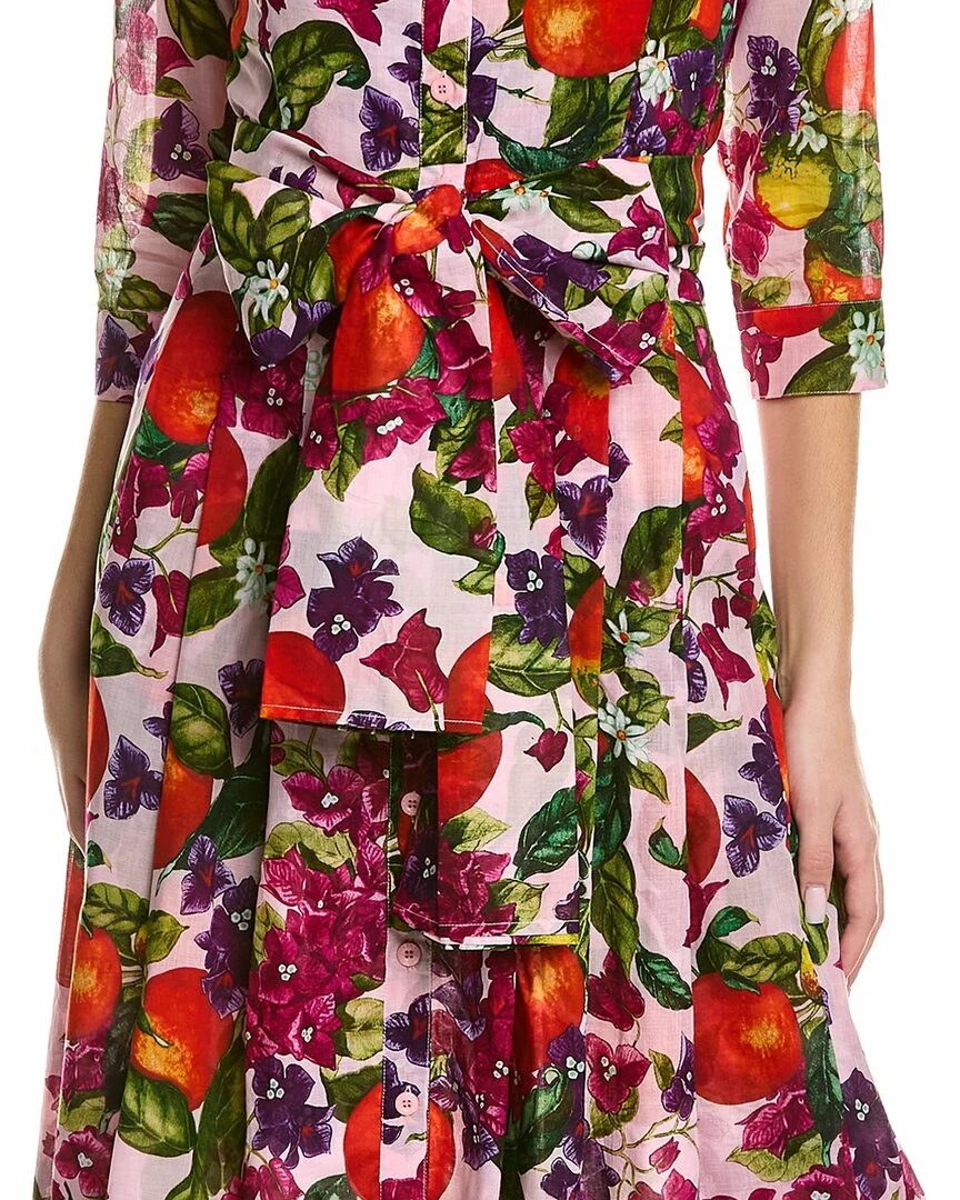 - Audrey 3 Shirtdress in soft pink Tuscan arancia with 3/4-length sleeves, pleated skirt, side seam pockets, belted waist, and tie sash