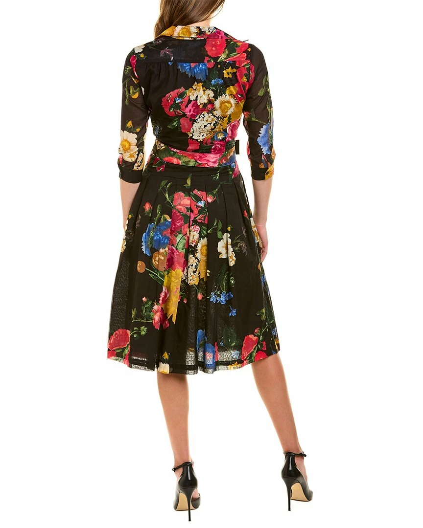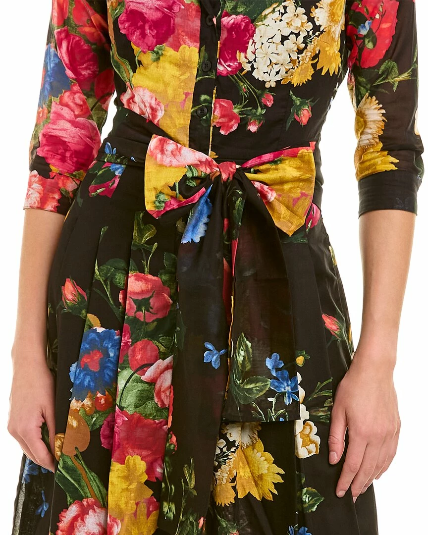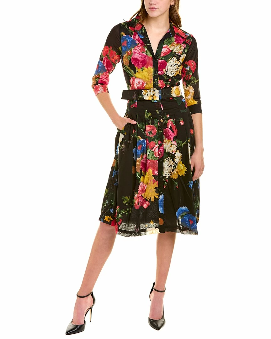 - Audrey 3 Shirtdress in black Rembrandt with 3/4-length sleeves, pleated skirt, side seam pockets, removable belt, and tie sash