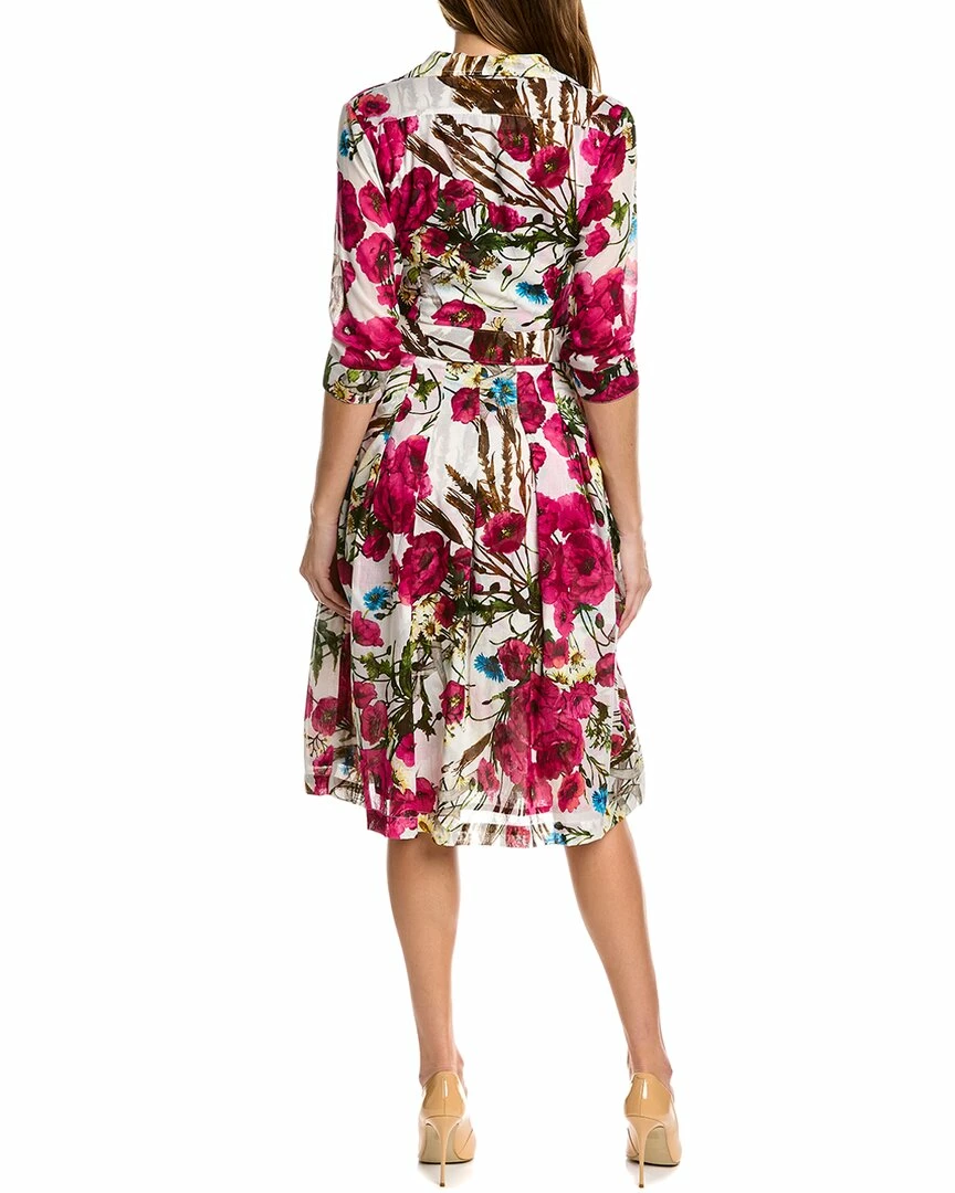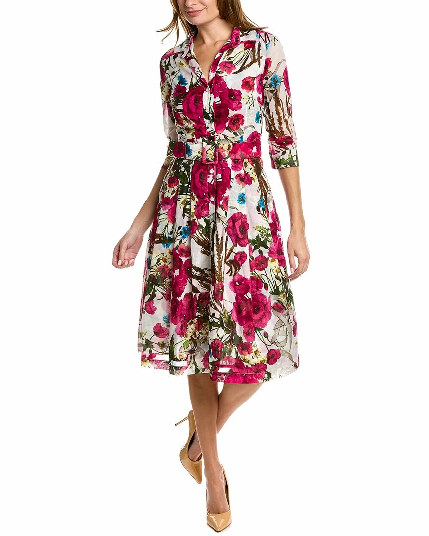 - Audrey 3 Shirtdress in white pink watercolor poppy with 3/4-length sleeves, pleated skirt, side seam pockets, removable belt, and tie sash
