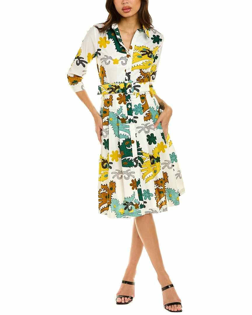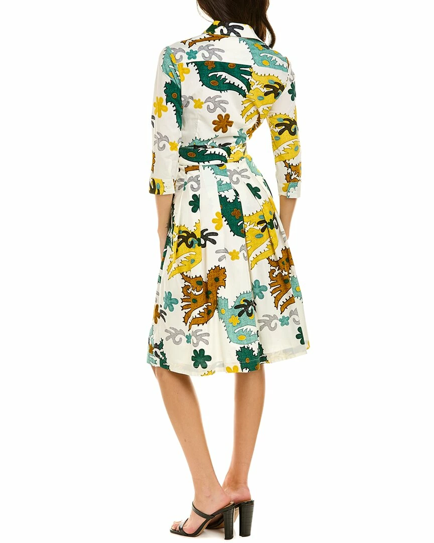 - Audrey 3 Shirtdress in jade and yellow Ukrainian bird with 3/4-length sleeves, pleated skirt, side seam pockets, detachable belt, and tie sash at waist