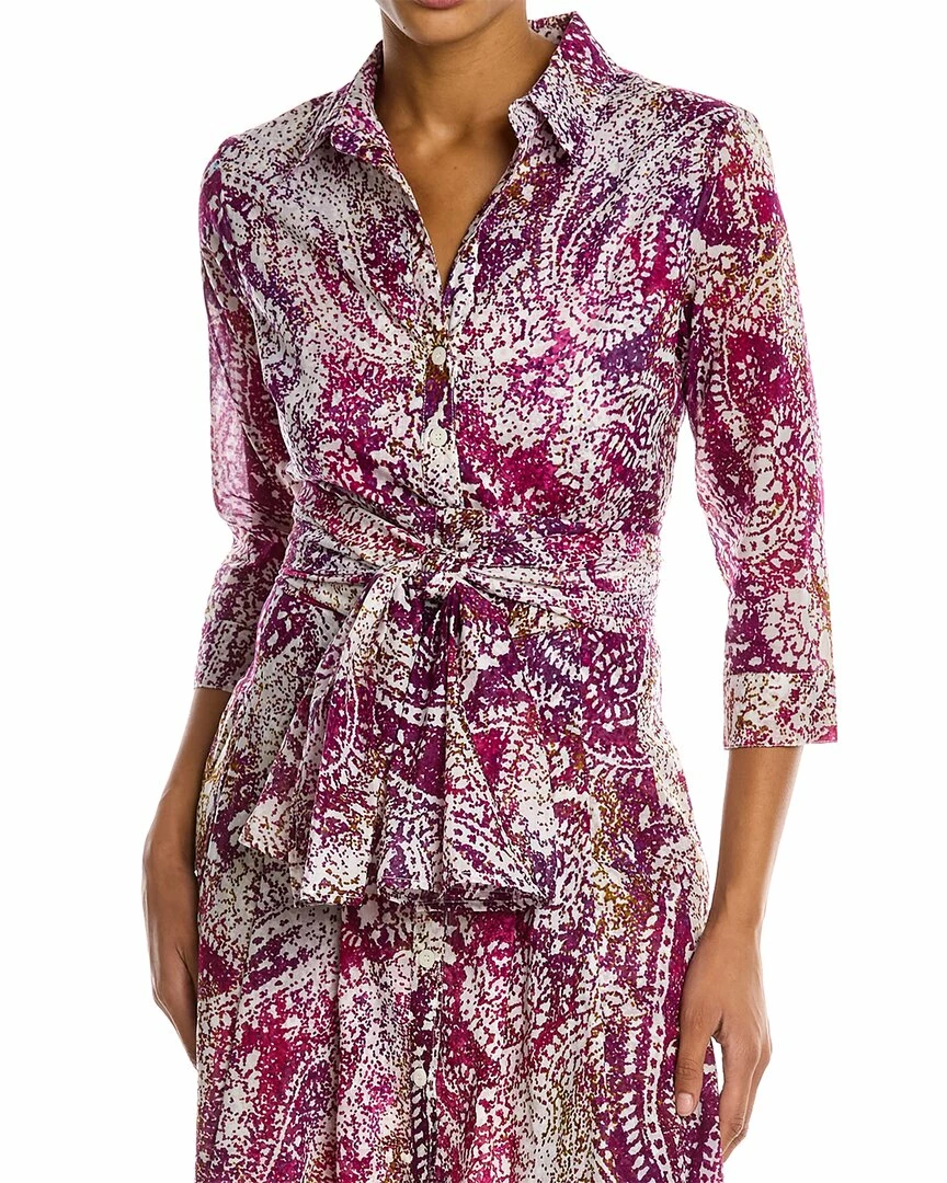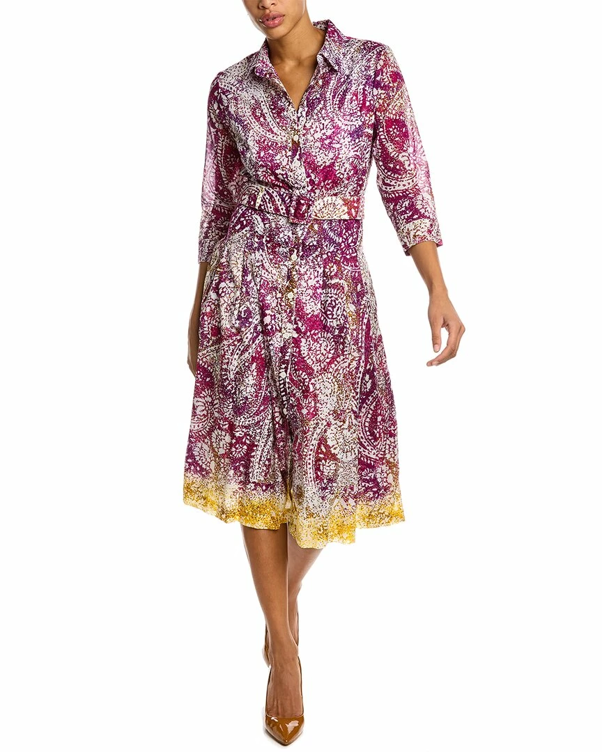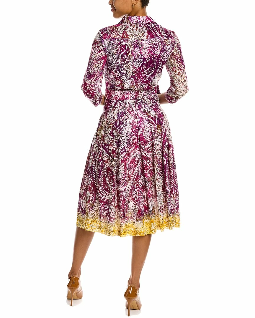 - Audrey 3 Shirtdress in pink indie paisley with 3/4-length sleeves, pleated skirt, side seam pockets, belted waist, and tie sash