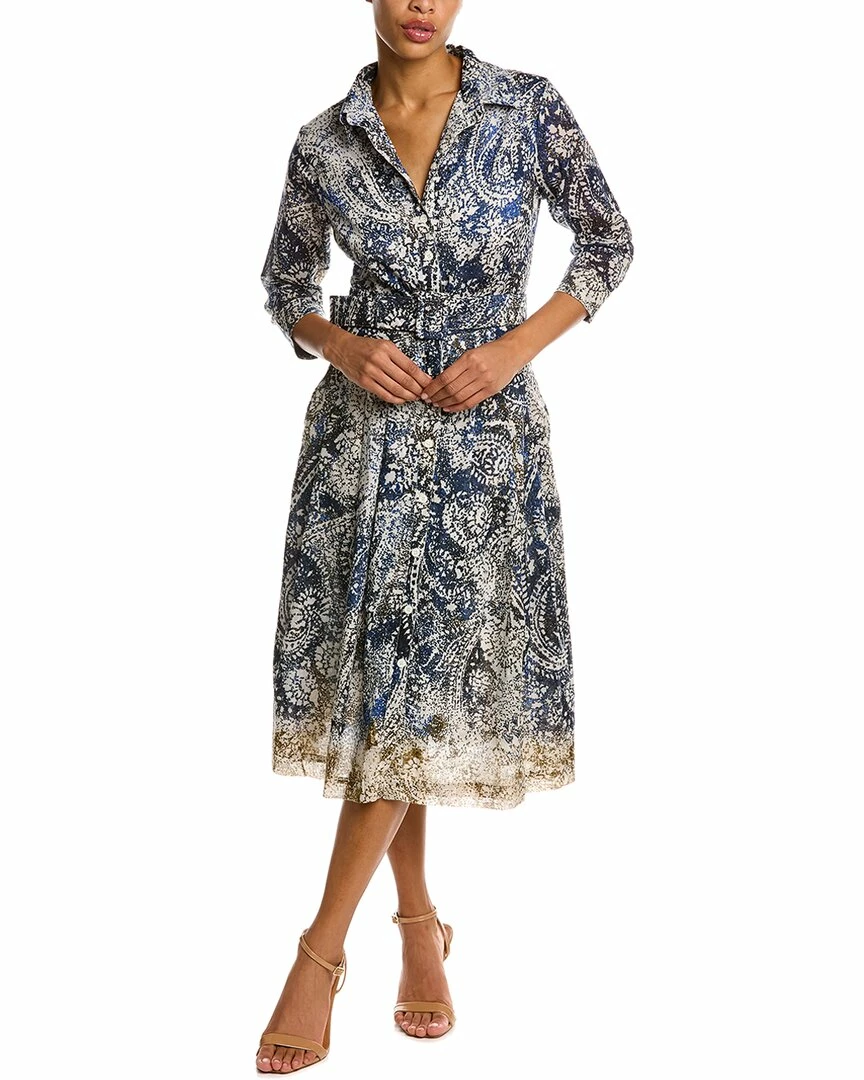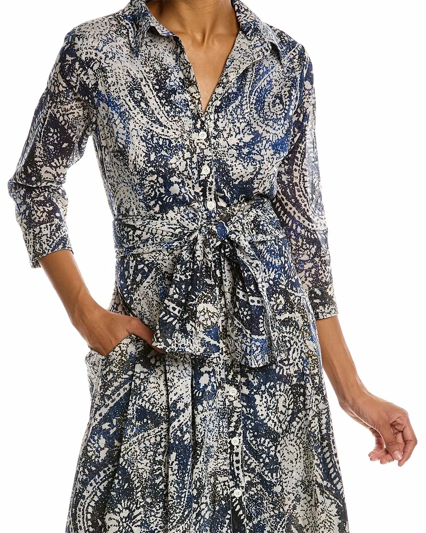 - Audrey 3 Shirtdress in indigo indie paisley with 3/4-length sleeves, pleated skirt, side seam pockets, belted waist, and tie sash
