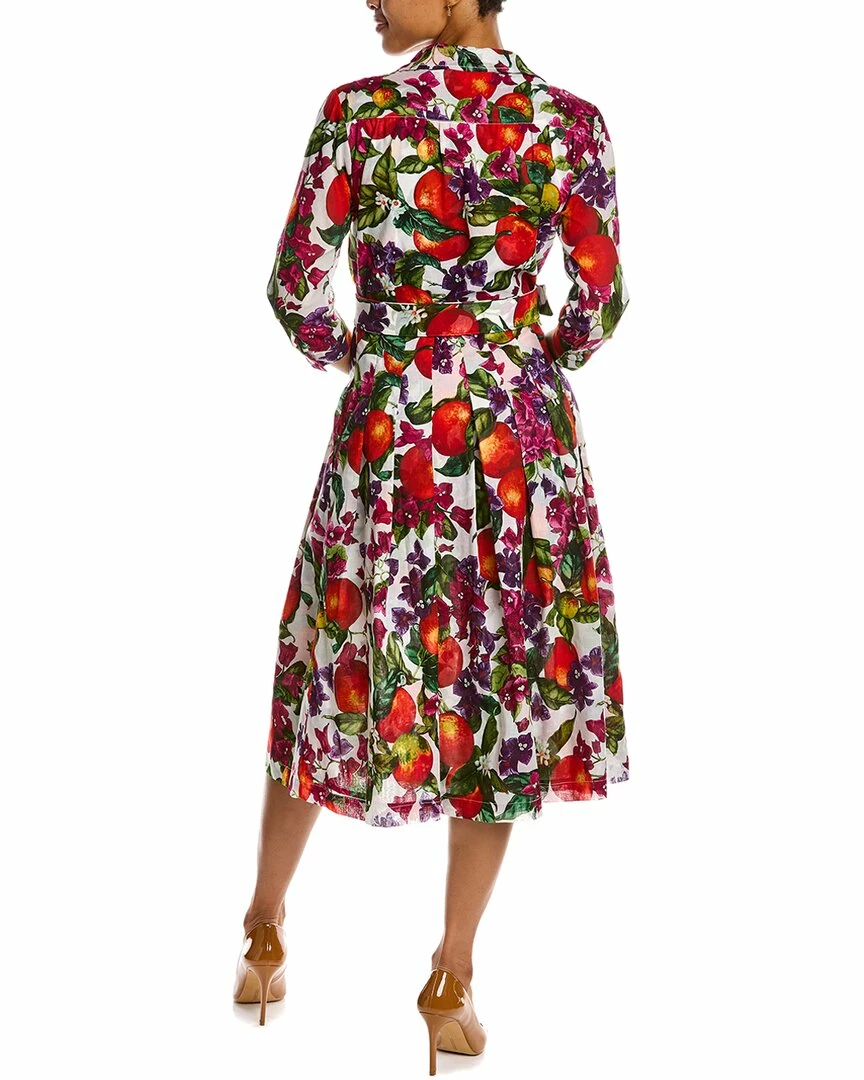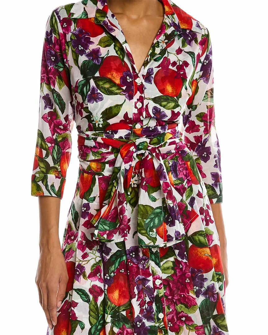 - Audrey 3 Shirtdress in white tuscani arancia with 3/4-length sleeves, pleated skirt, side seam pockets, belted waist, and tie sash