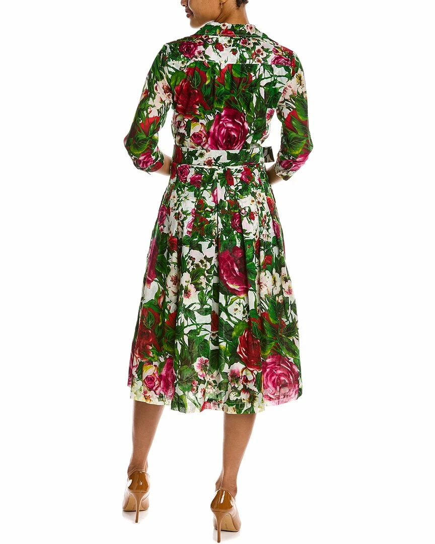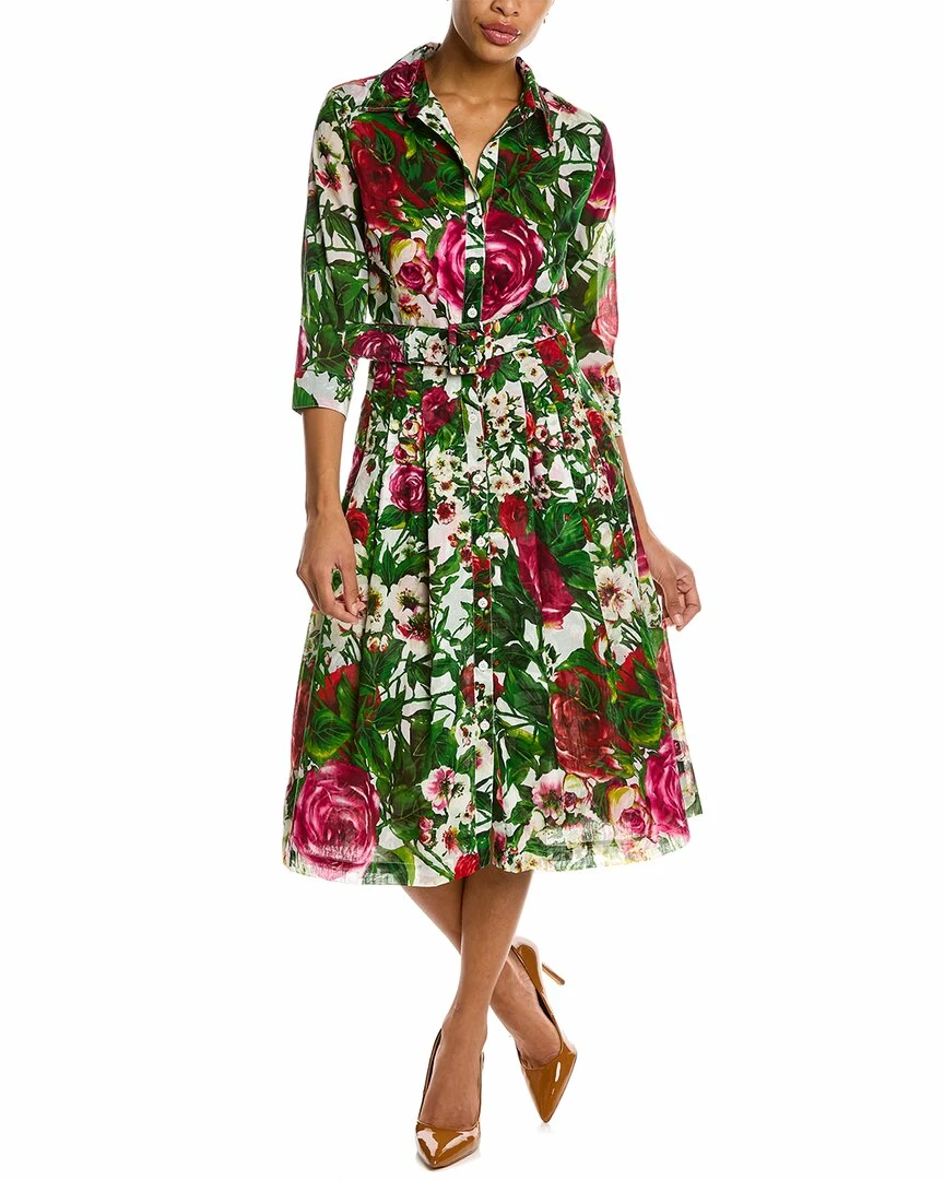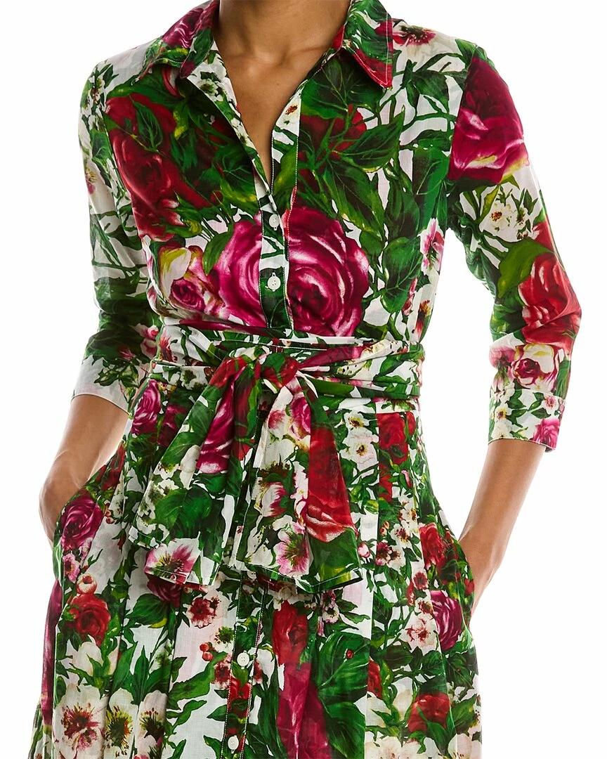 - Audrey 3 Shirtdress in white multi rose garden with 3/4-length sleeves, pleated skirt, side seam pockets, belted waist, and tie sash