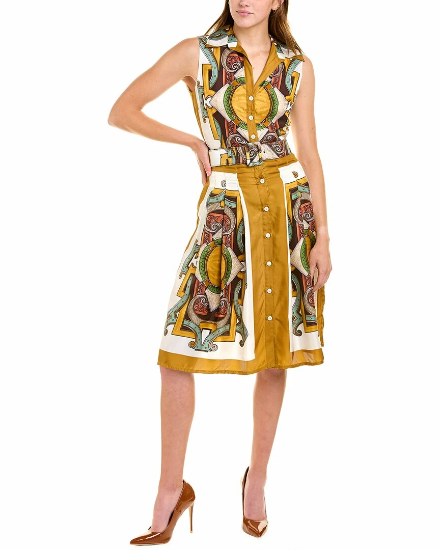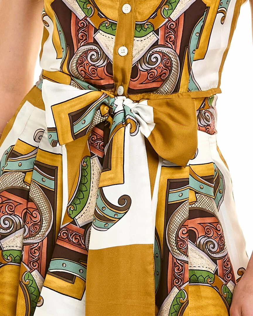 - Audrey 3 Shirtdress in gold geometric with pleated skirt, side seam pockets, belted waist, and tie sash