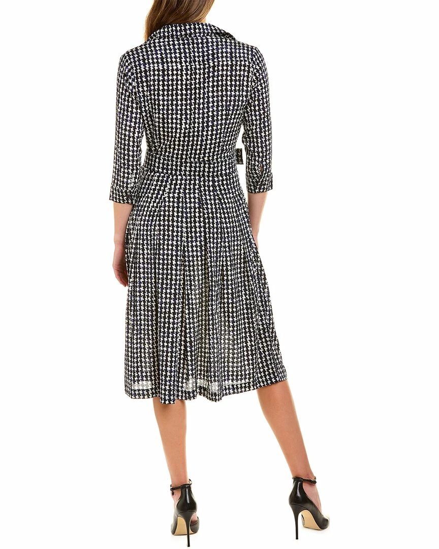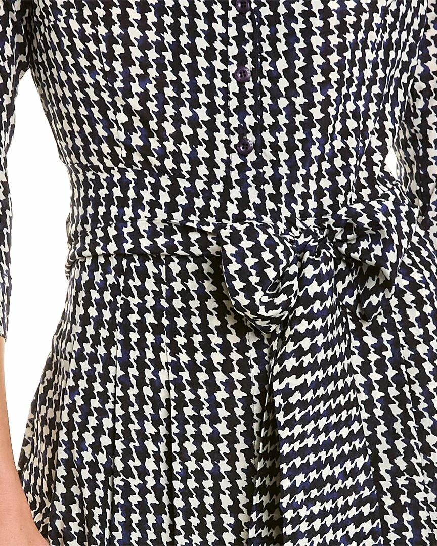 - Audrey 3 Silk Shirtdress in indigo houndstooth with 3/4-length sleeves, pleated skirt, side seam pockets, removable belt, and tie sash