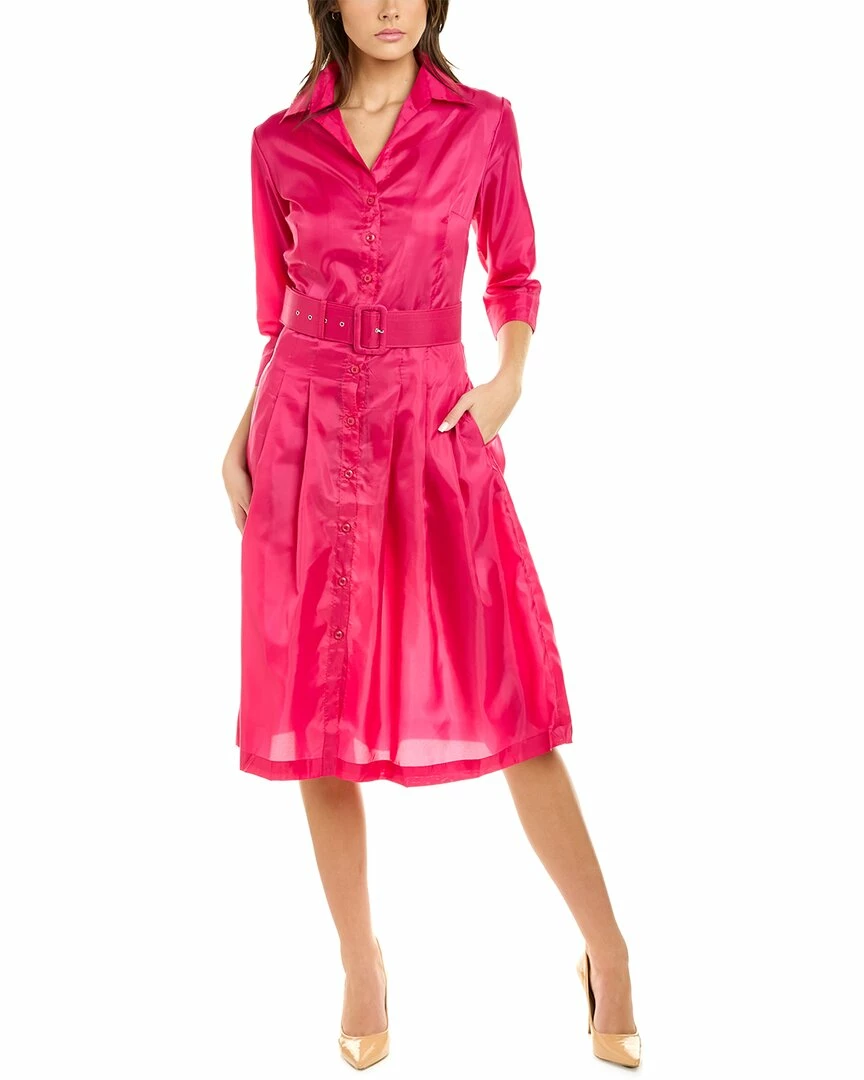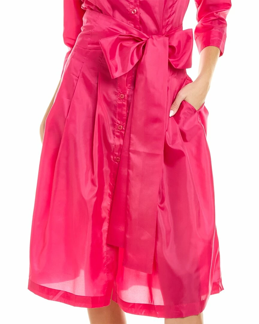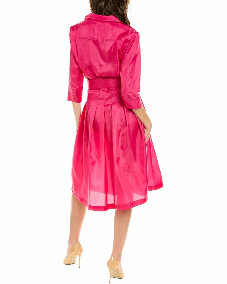 - Audrey 3 Silk Shirtdress in pink solid with spread collar, pleated skirt, dual side on-seam pockets, and removable belt