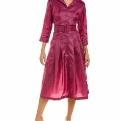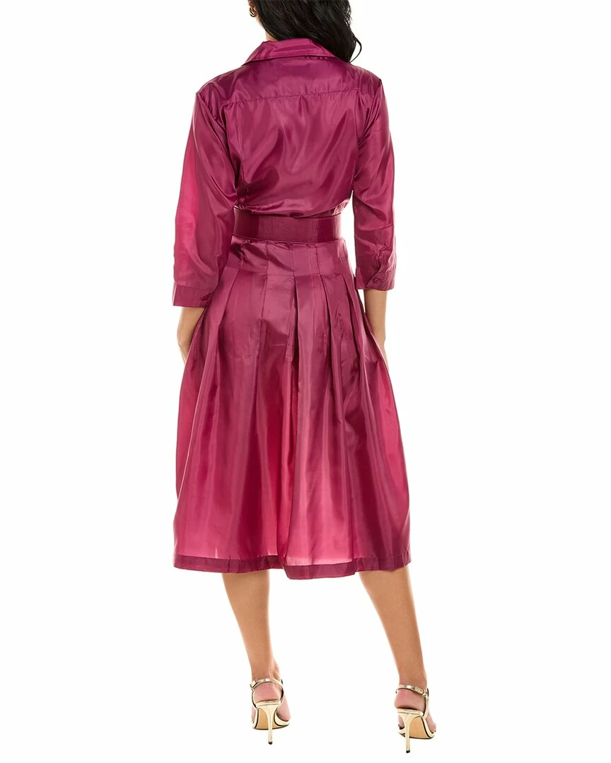 - Audrey 3 Silk Shirtdress in magenta solid with spread collar, pleated skirt, dual side on-seam pockets, and removable belt
