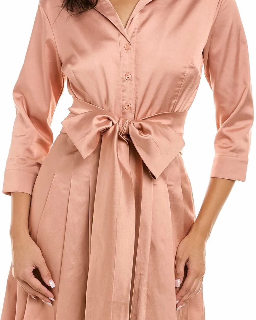 - Audrey 3 Silk Shirtdress in blush solid with spread collar, pleated skirt, dual side on-seam pockets, and removable belt