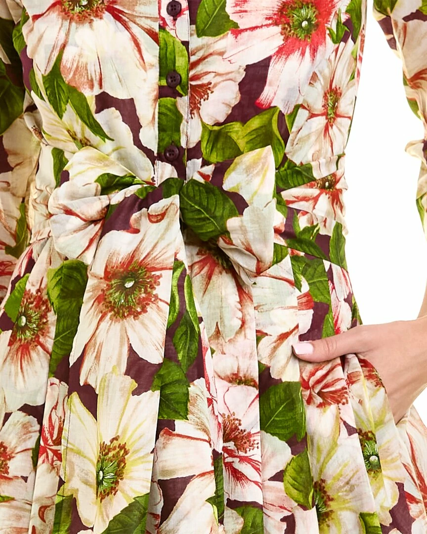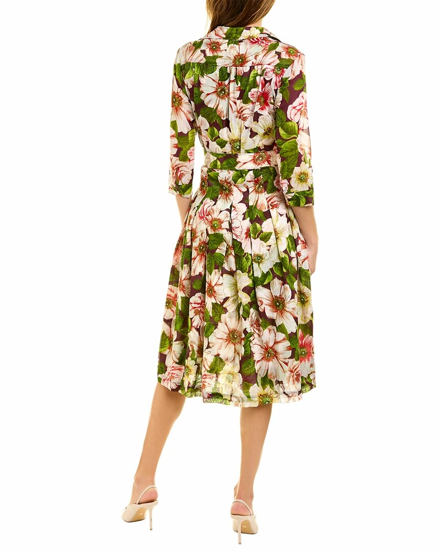 - Audrey 4 Shirtdress in plum pink anemone virginia with 3/4-length sleeves, pleated skirt, side seam pockets, belted waist, and tie sash