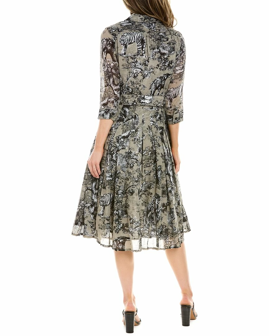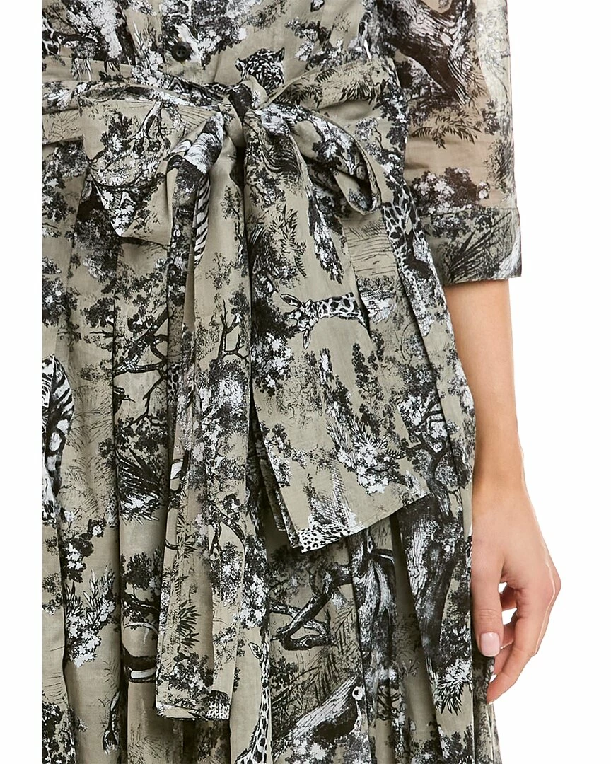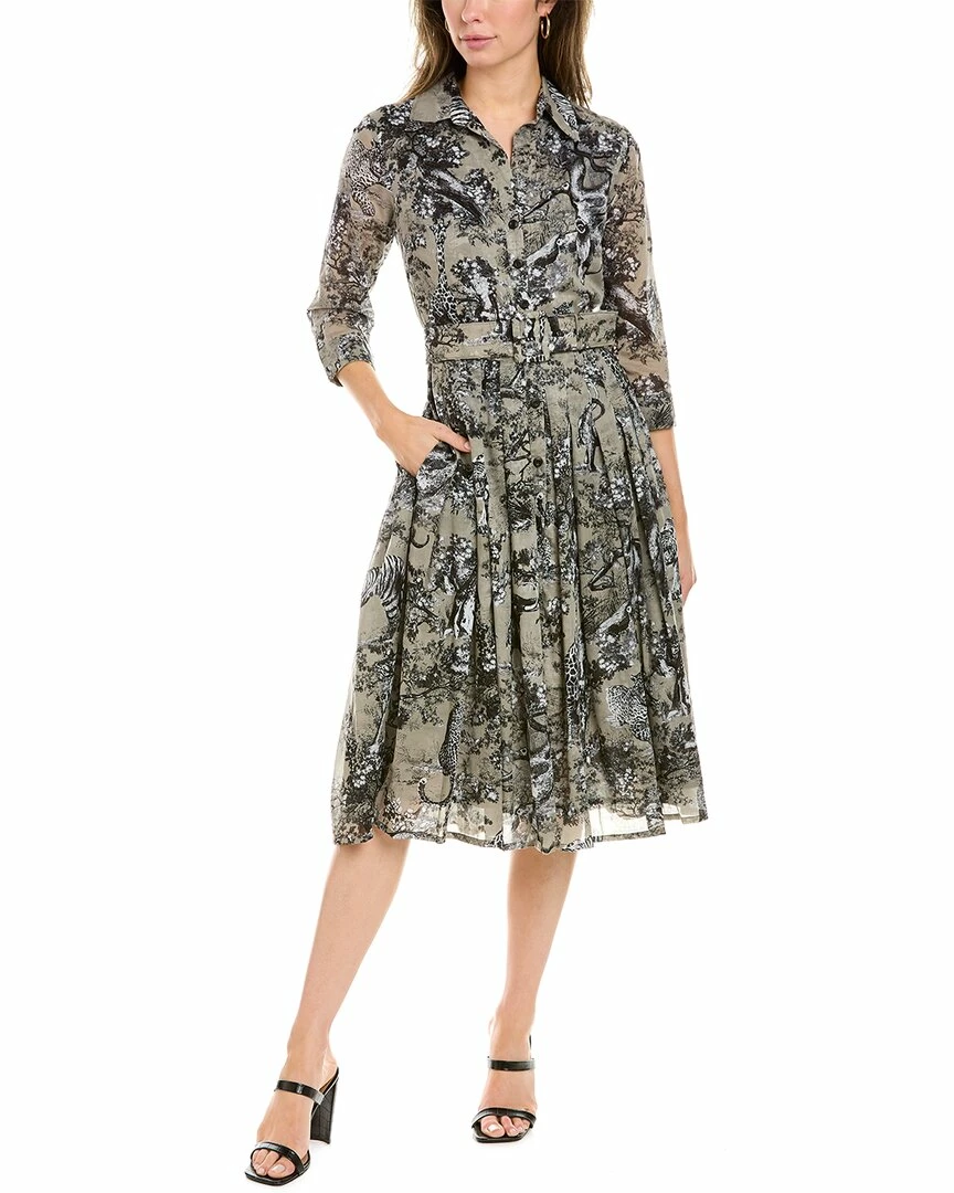 - Audrey 4 Shirtdress in taupe safari toile with 3/4-length sleeves, pleated skirt, side slip pockets, belted waist, and removable tie-sash
