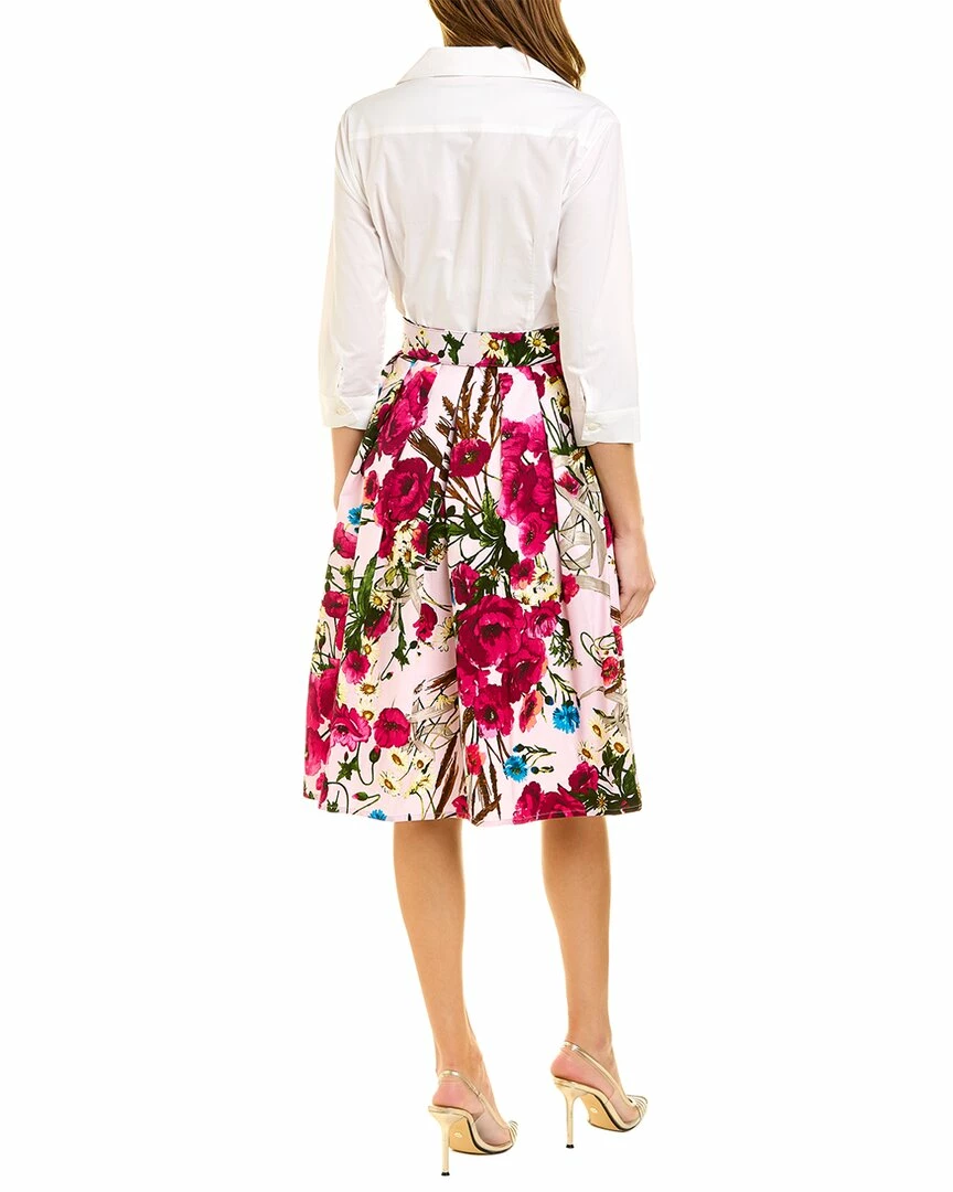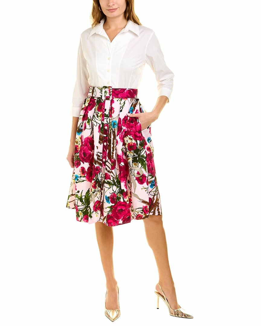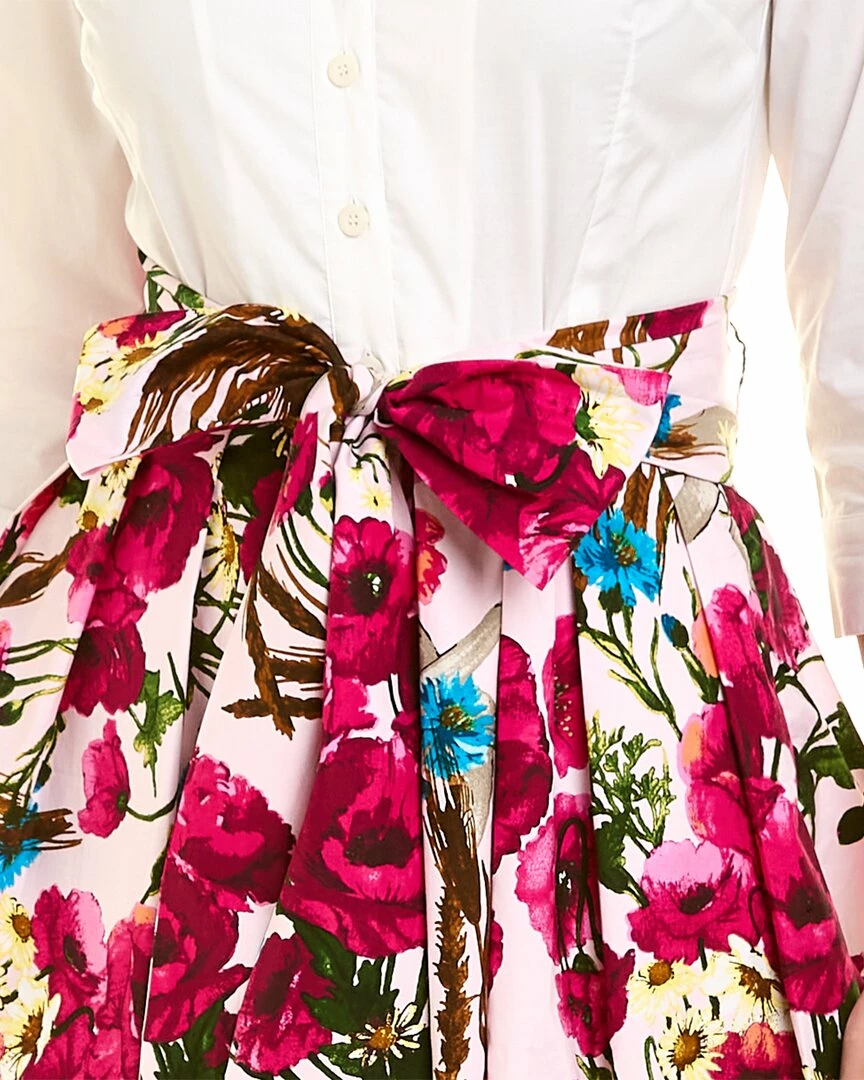 - Audrey Contrast Midi Shirtdress in white, pink multicolor floral with Blouse top, 3/4-length sleeves with button cuff, pleated skirt with side seam pocket, belt and sash included