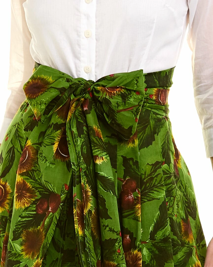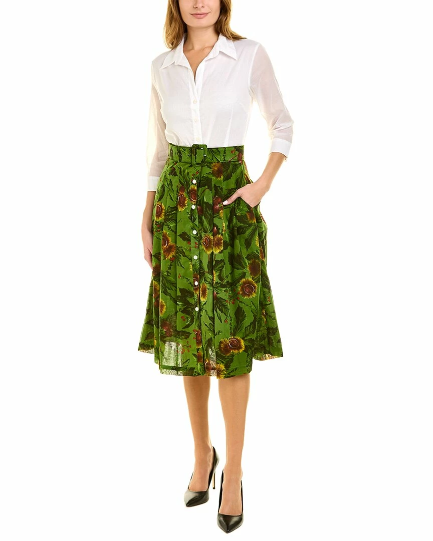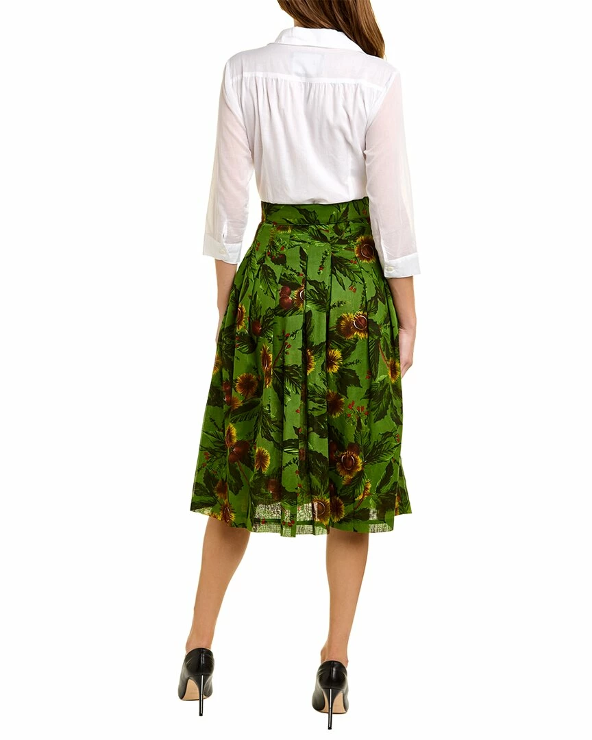 - Audrey Contrast Midi Shirtdress in white, green, and yellow combo floral with Blouse top, 3/4-length sleeves with button cuff, pleated skirt with side seam pocket, belt and sash included