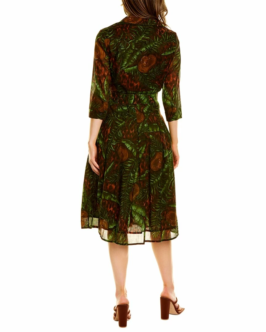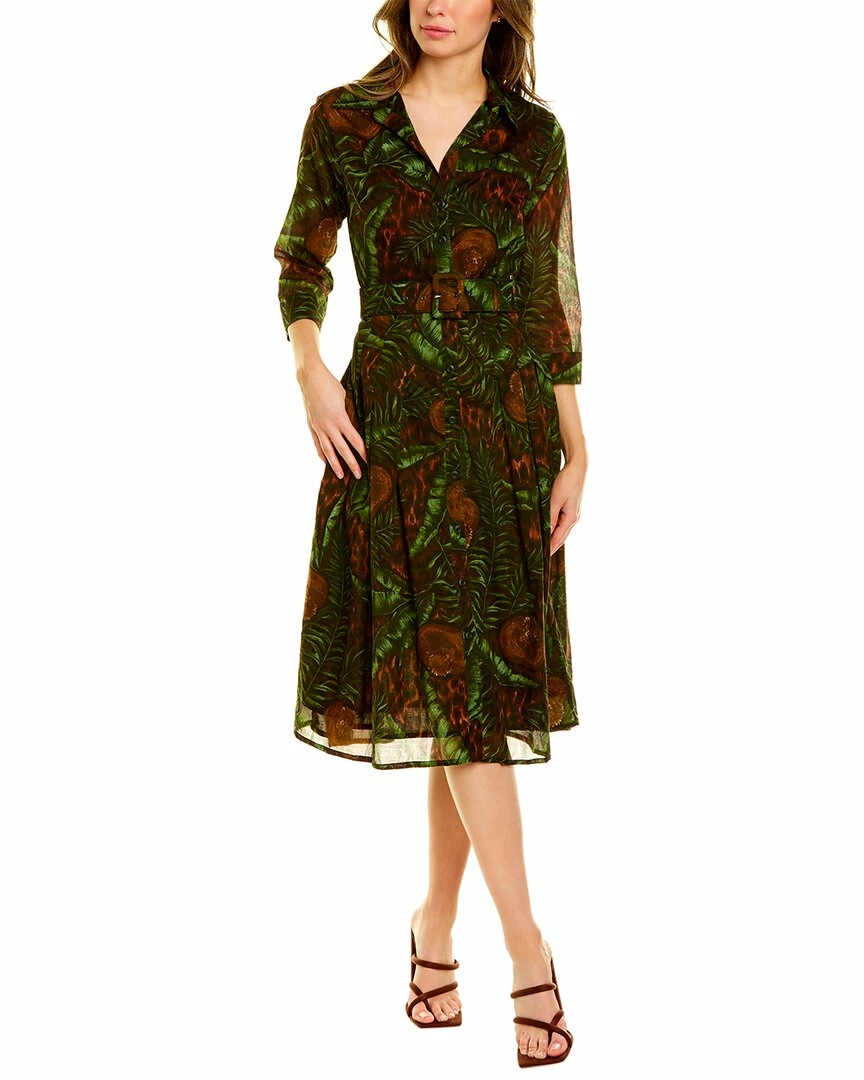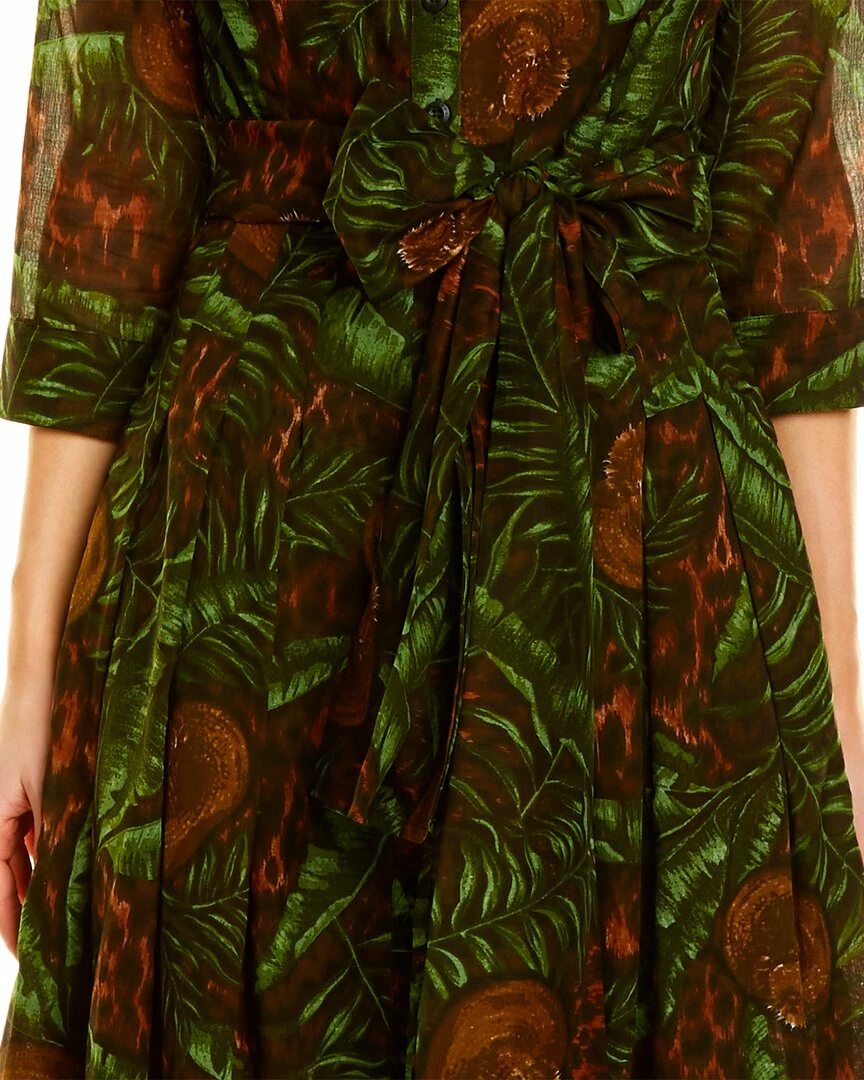 - Audrey D #3 Shirtdress in daintree jungle brown green with spread collar, pleated skirt, dual side on-seam pockets, and removable belt