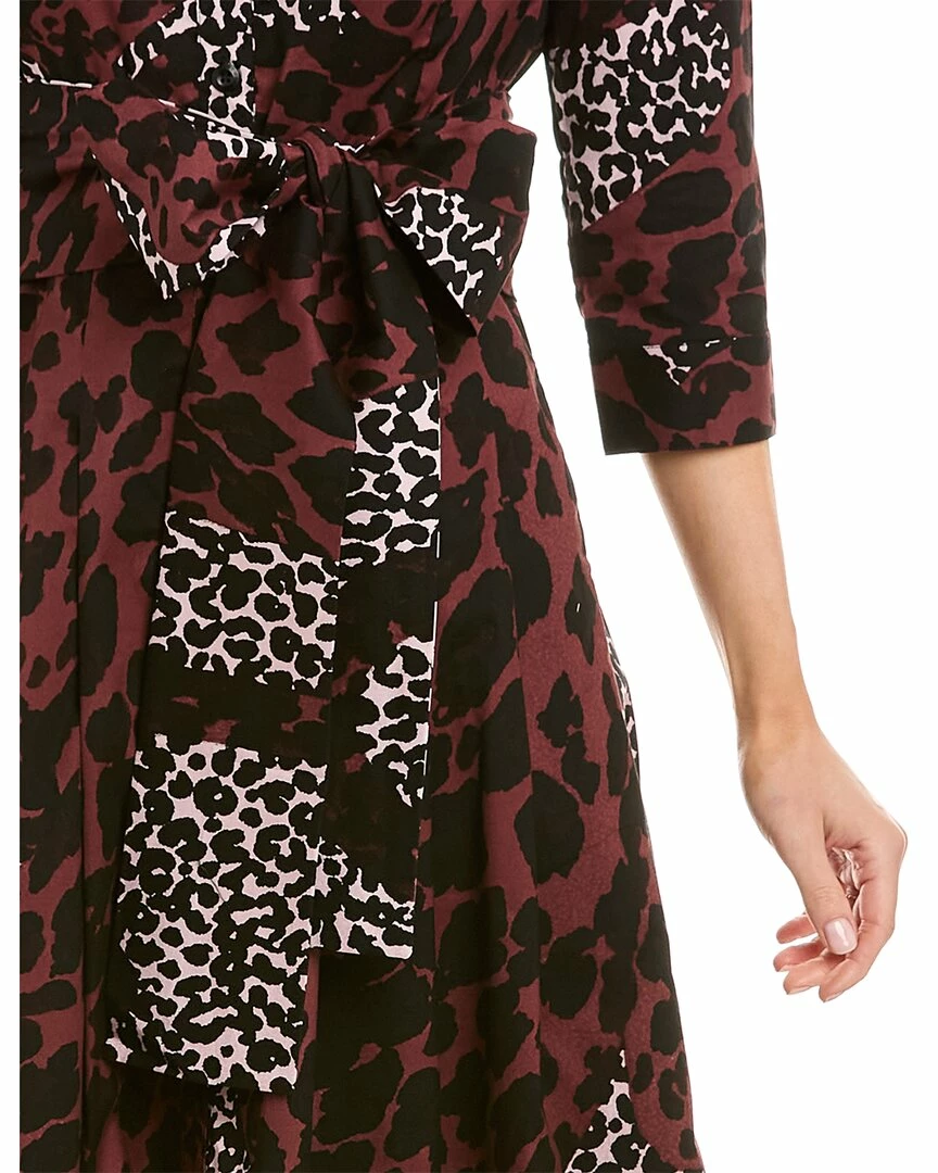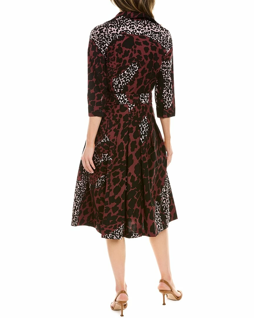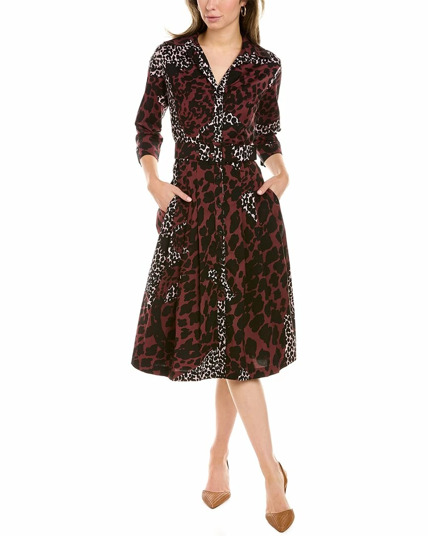 - Audrey D #3 Shirtdress in burgundy leopard combo with spread collar, pleated skirt, dual side on-seam pockets, and removable belt