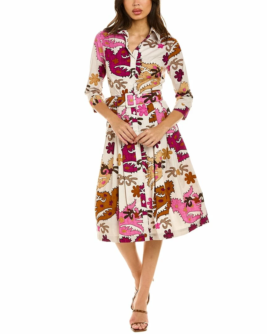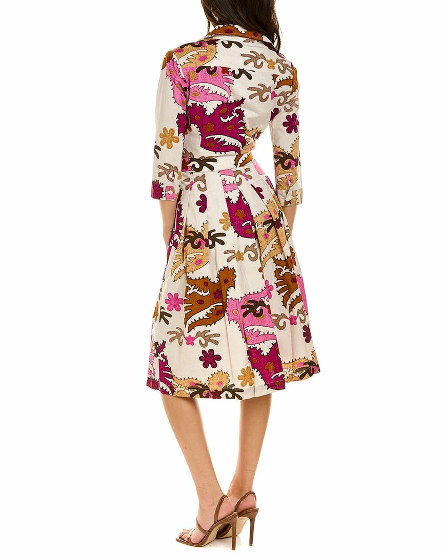 - Audrey D #3 Shirtdress in beige magenta ukrainian bird with spread collar, pleated skirt, dual side on-seam pockets, and removable belt