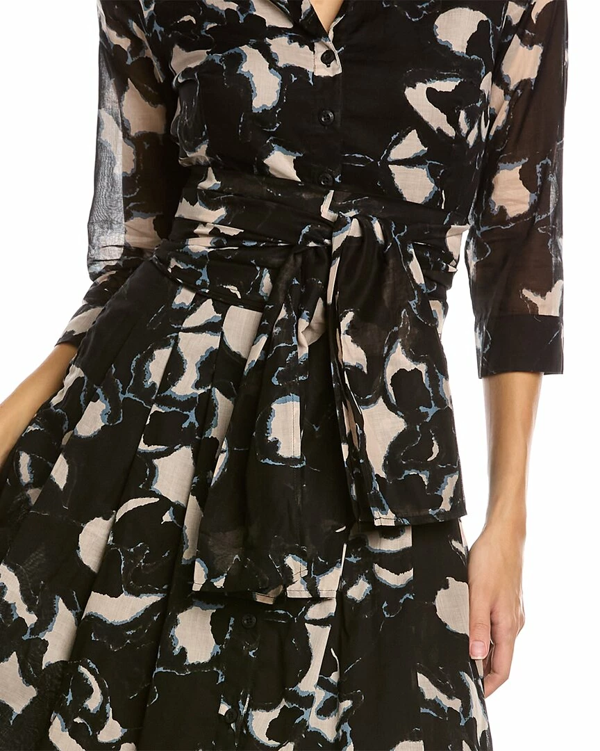 - Audrey D 3 Shirtdress in rose abstract pace with spread collar, pleated skirt, dual side on-seam pockets, and removable belt