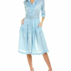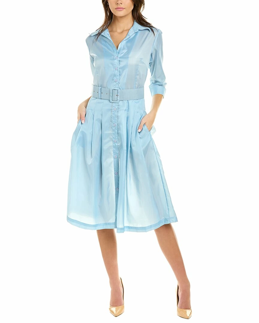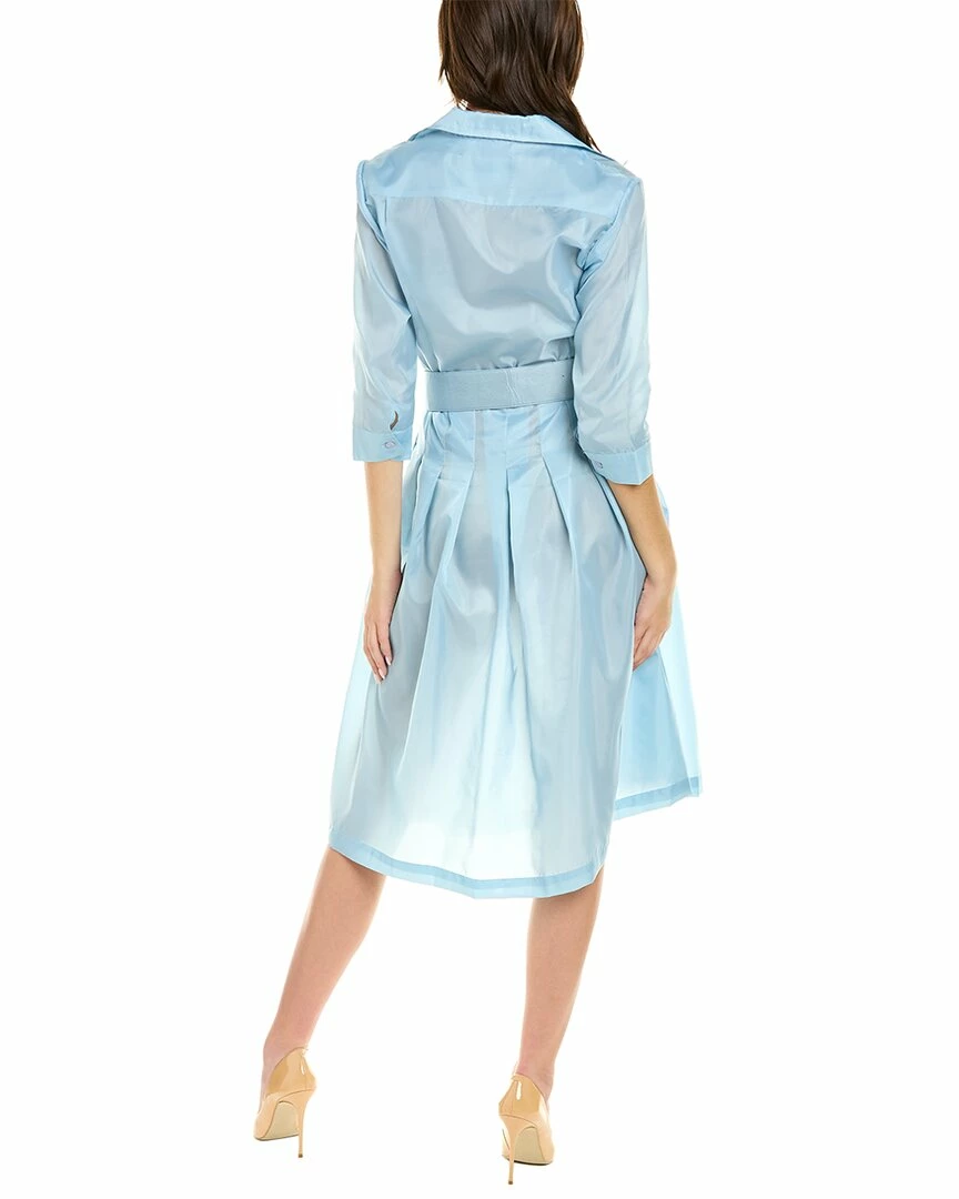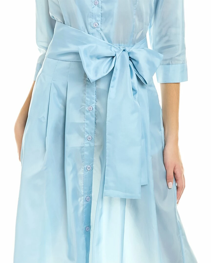 - Audrey D 3 Silk Shirtdress in ice blue solid with spread collar, pleated skirt, dual side on-seam pockets, and removable belt