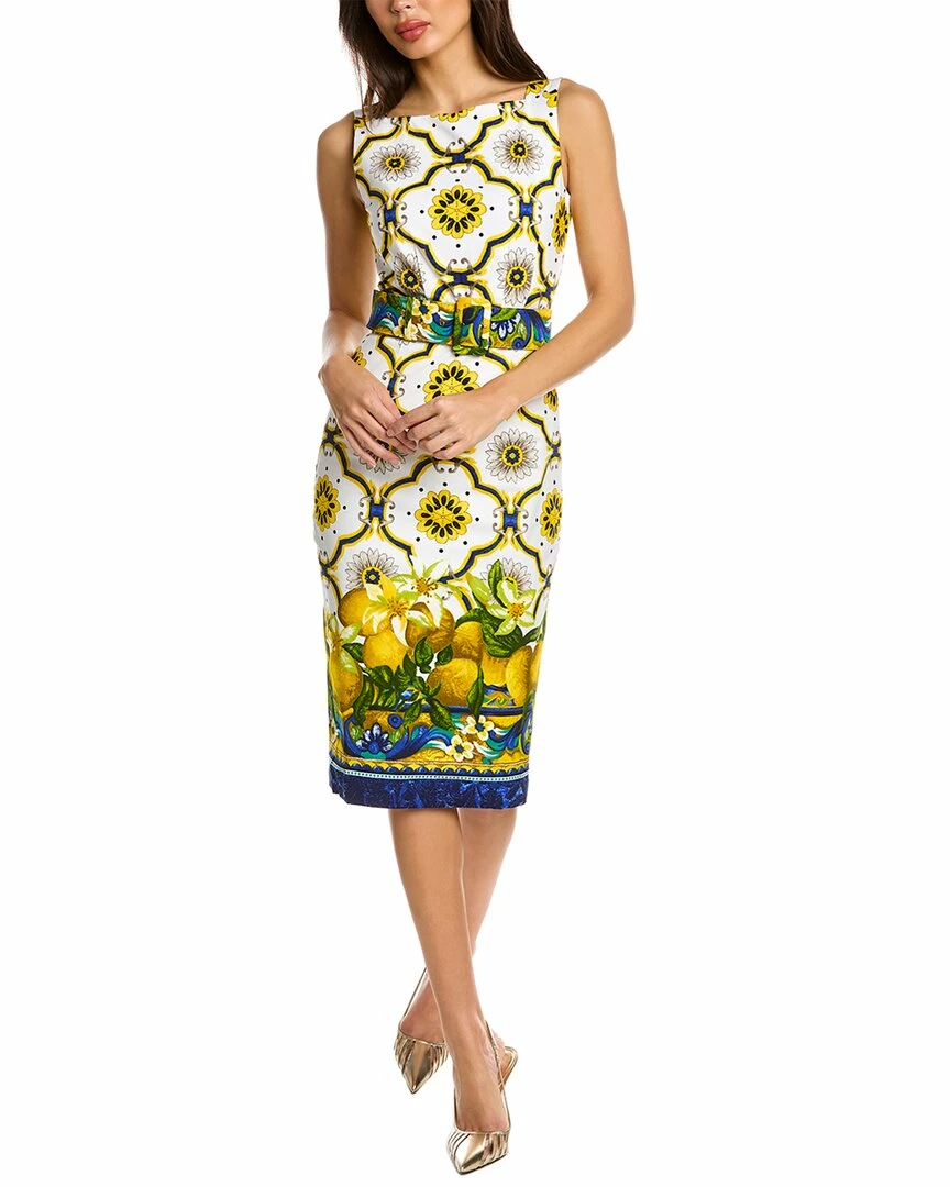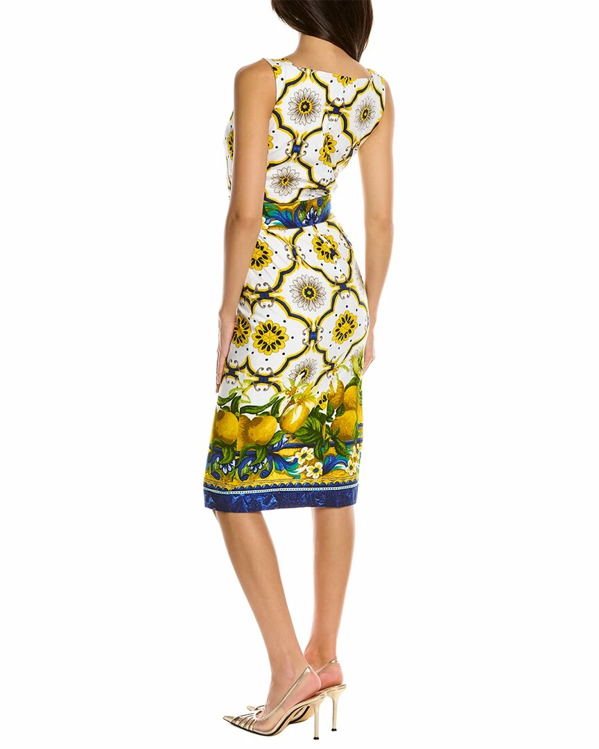 - Celine Sheath Dress in yellow Sicilian lemon with square boat neck, belted waist and center vent at back hem