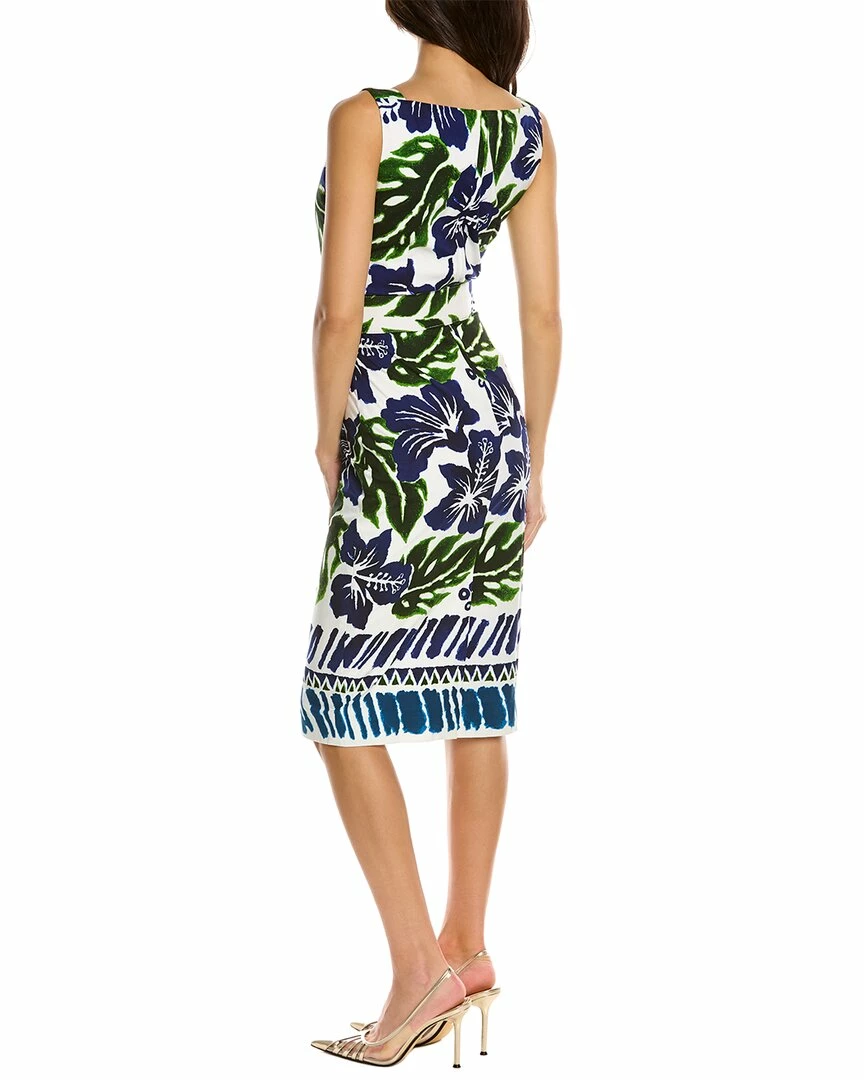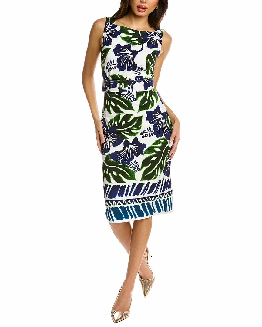 - Celine Sheath Dress in white cobalt blue lanai hibisc with baotneck, self-tie sash at waist, removable belt, and vented back hem