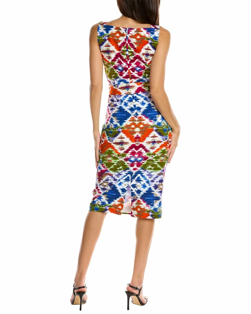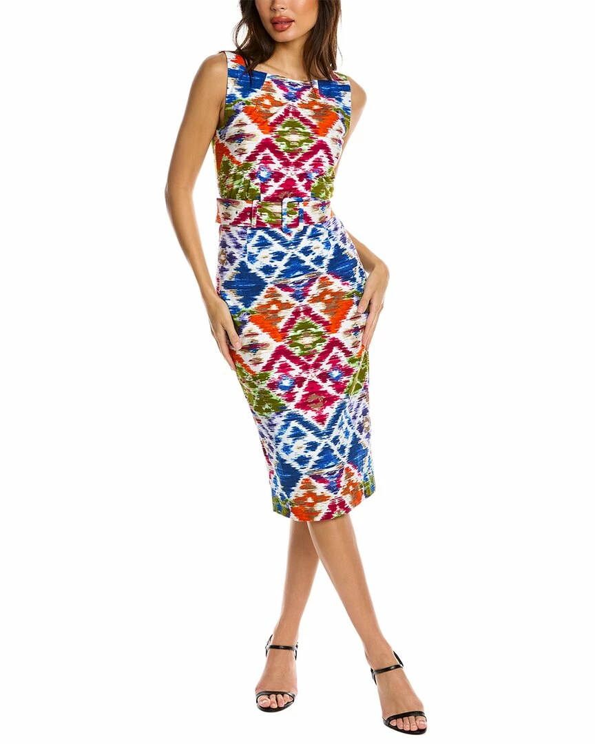 - Celine Sheath Dress in w. multi diamond ikat with square boat neck, belted waist and center vent at back hem