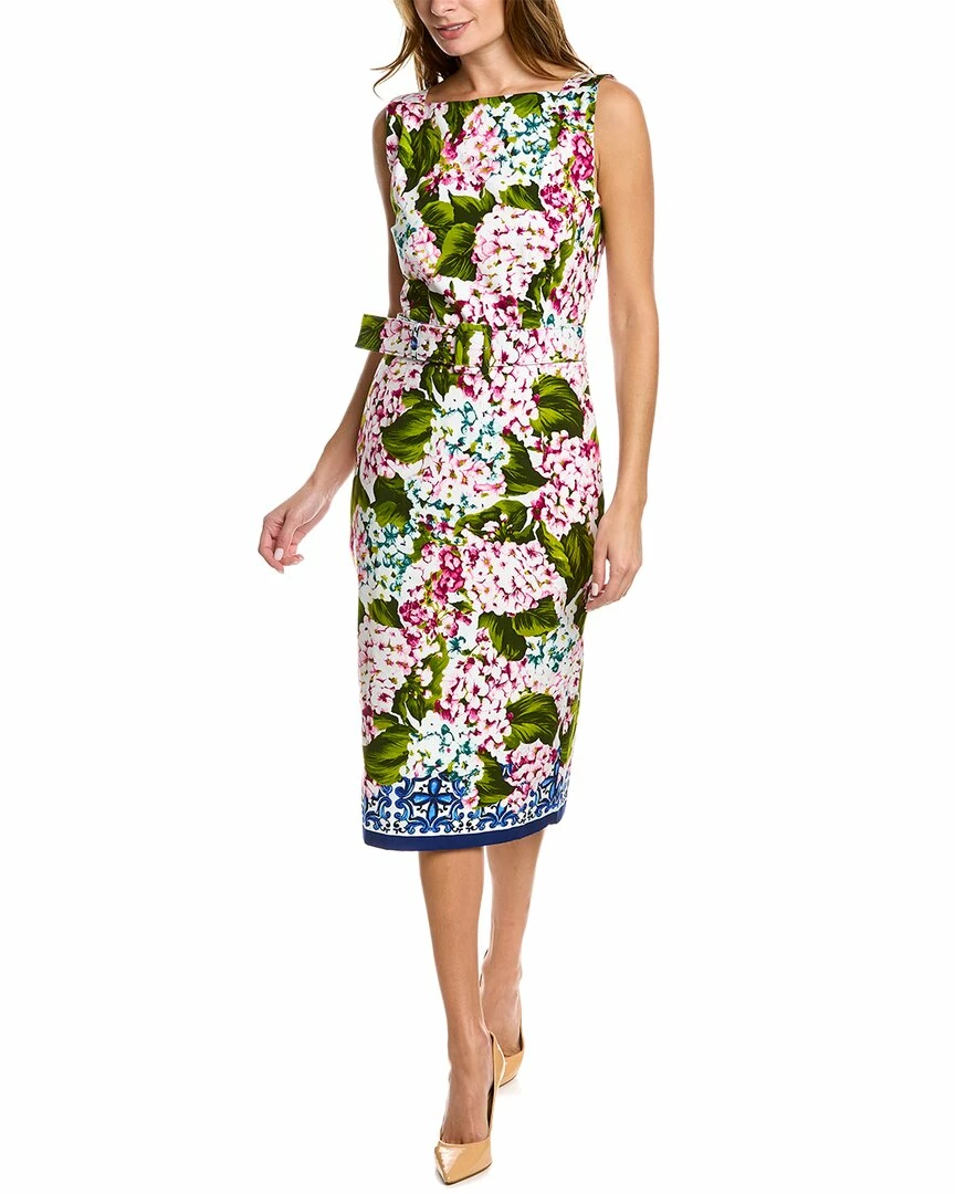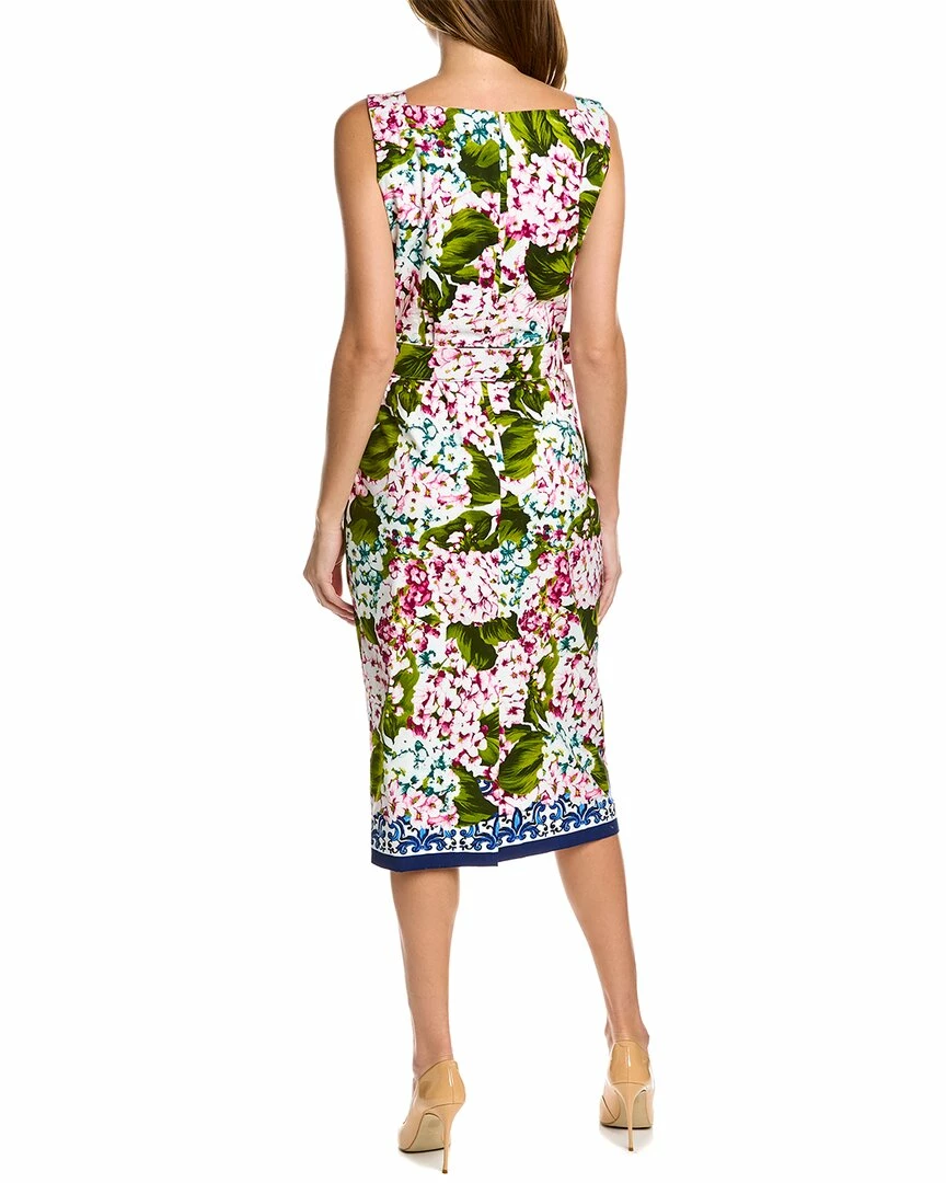 - Celine Sheath Dress in white multi hydrangea on tile with square neckline, belted waist and center vent at back hem