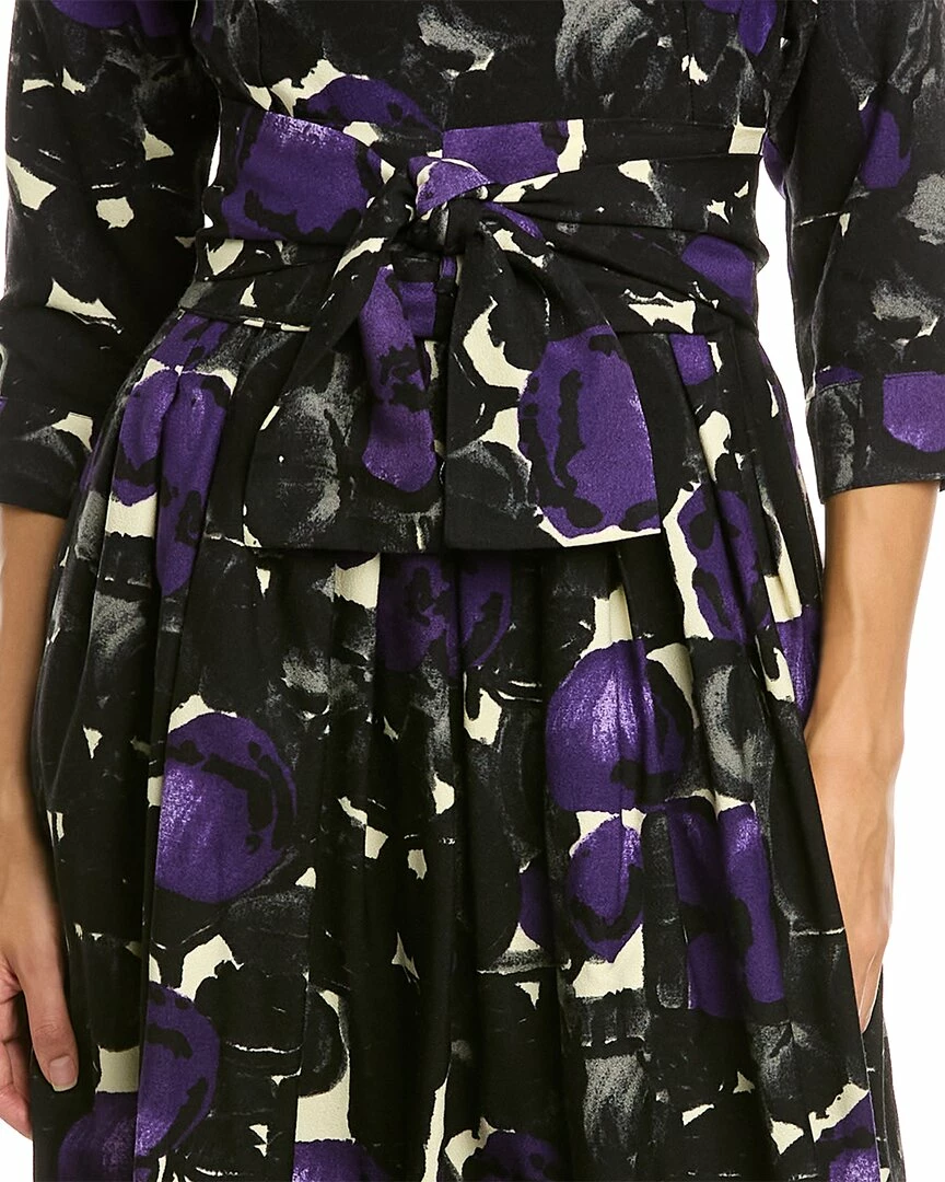 - Florance A-Line Dress in lilac peony with 3/4-length sleeves, button cuffs, pleated skirt, dual side on-seam pockets, removable belt, and self-tie sash at waist